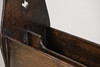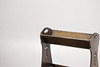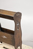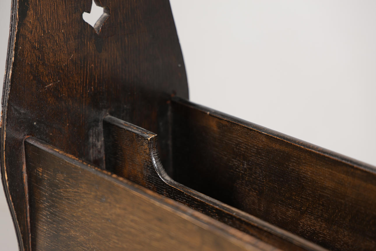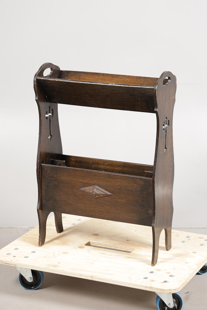 Having a book trough compartment above a twin newspaper or book rack below, with pierced Arts and Crafts motifs to each end and diamond lozenge each side, 52cm wide, 75.5cm high.