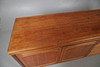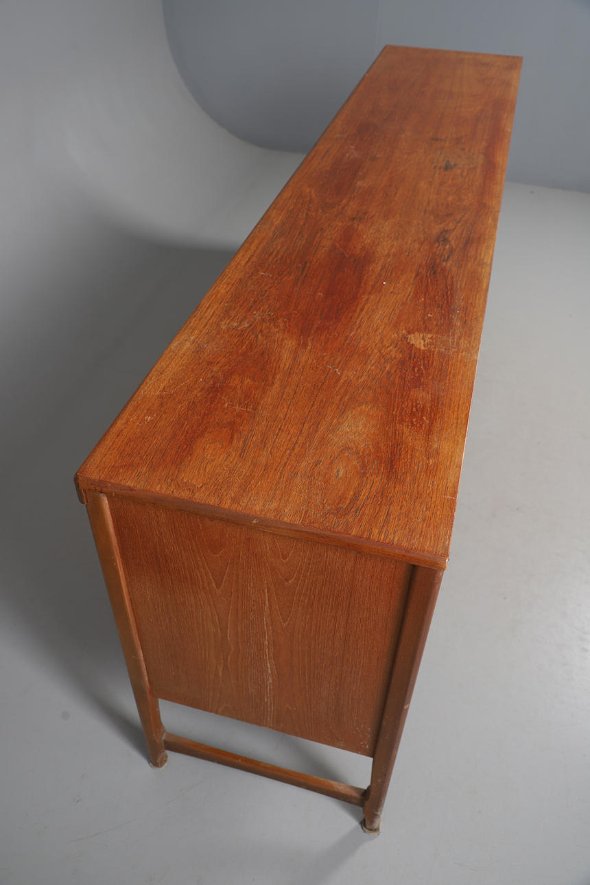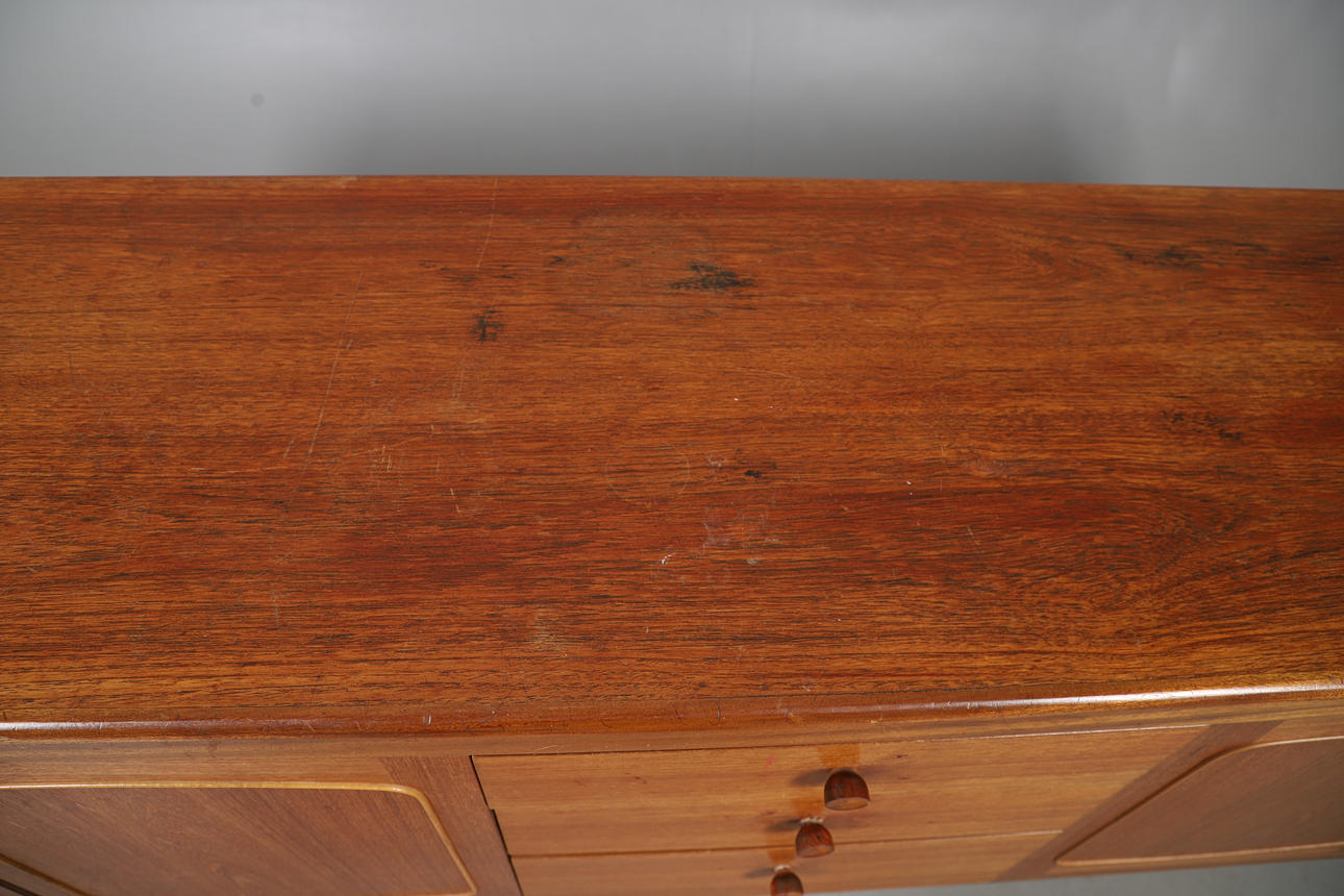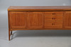 A large teak sideboard, with three central drawers flanked by large cupboards on each side. With a Nathan label to the drawer. 211cms long, 77.5cms high.