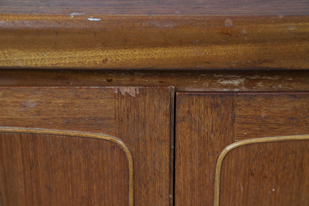 Top with various stains, marks and scratches, small chips around the doors in places, two drawer handles have come off and been restuck on, some marks and scuffs to the legs.