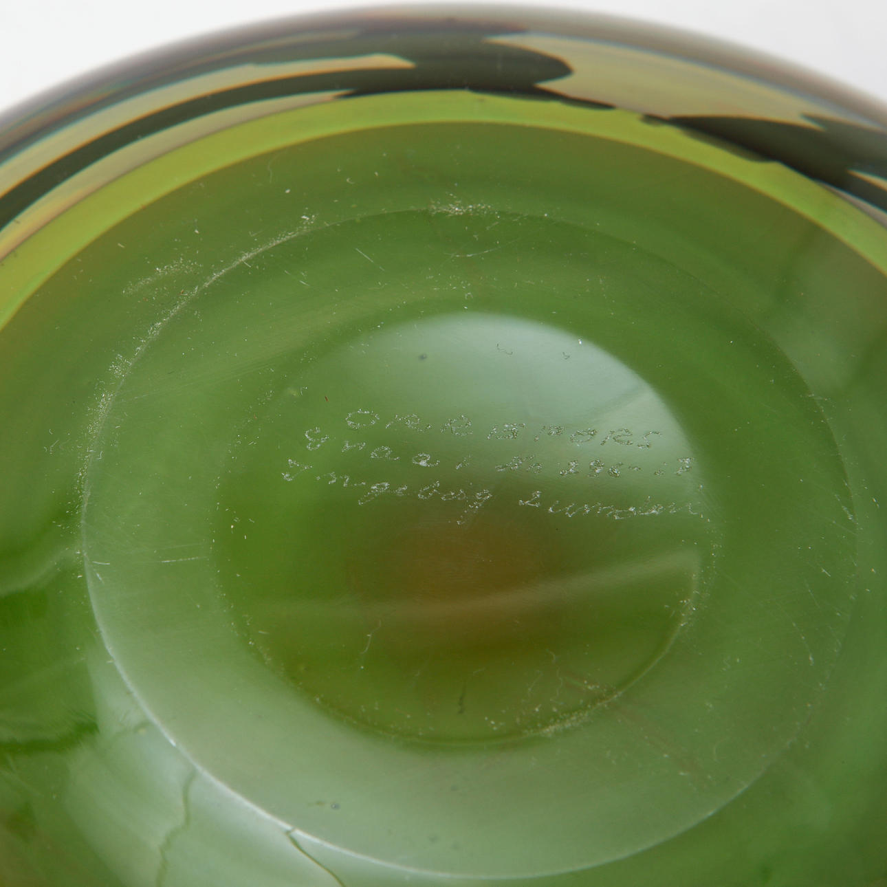Underscore in green and yellow tones. Signed “ORREFORS graal No 286-67 Ingeborg Lundin”. Diameter approx. 19 cm, height approx. 10 cm.