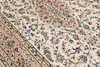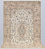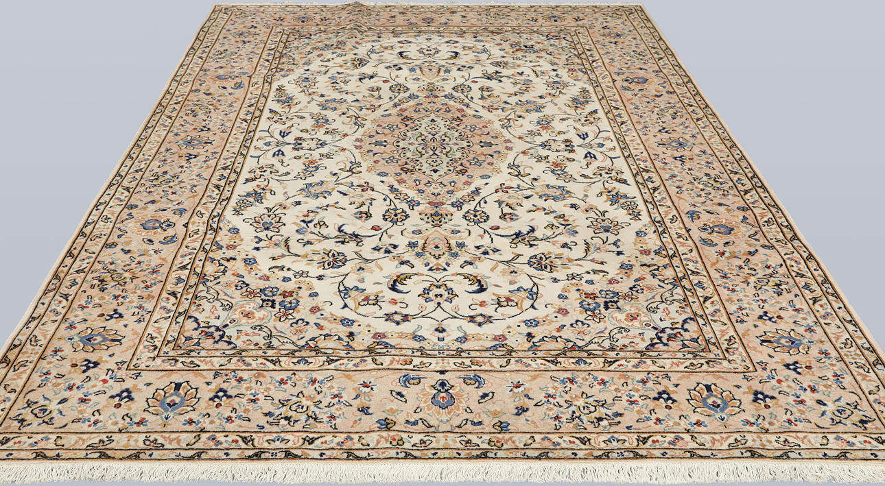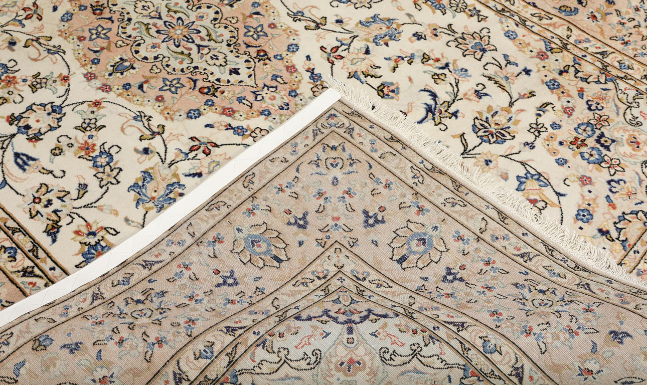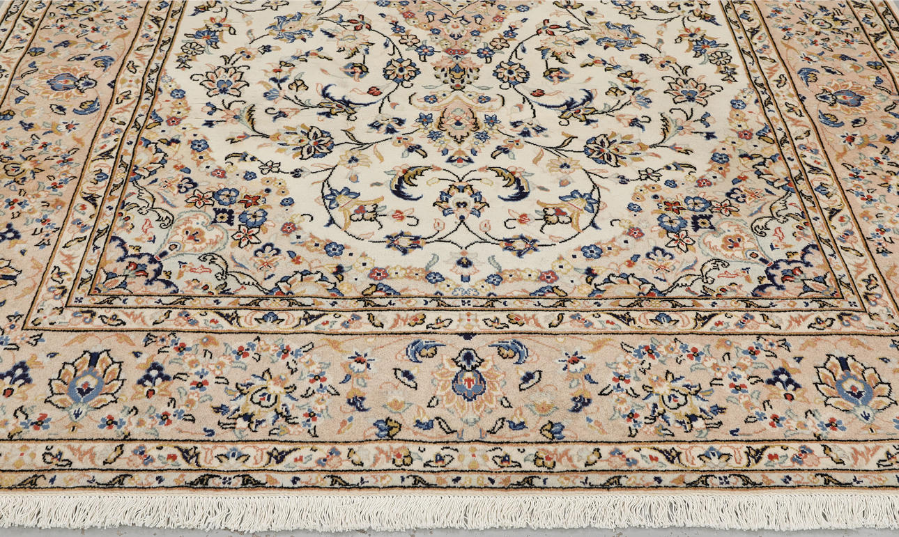 Keshan with bright bottom color and a centrally placed medallion with details in light shades of blue, beige, red and yellow. The center field is covered with floral ornamentation, palmettes and arabesques in similar shades. The border has a beige bottom and decor of palm branches. The forelock is made of wool and the warp is of cotton.