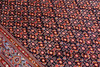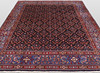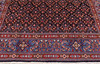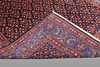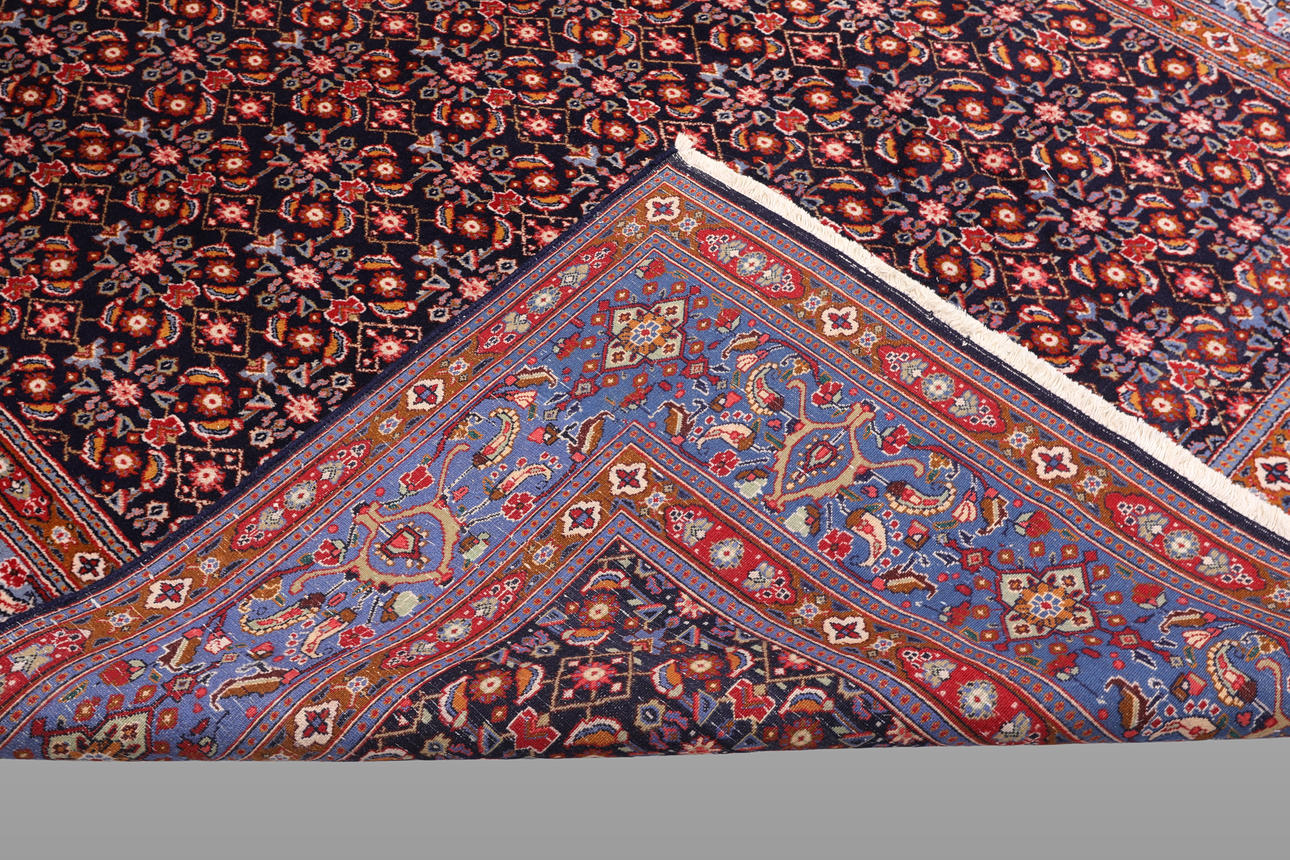 Moud with dark ground colour and a centre field covered in Herati patterns in red, light blue and yellow. The border has a light blue bottom with a decor of stylized vegetation. The forelock is made of wool and the warp is of cotton.