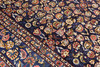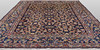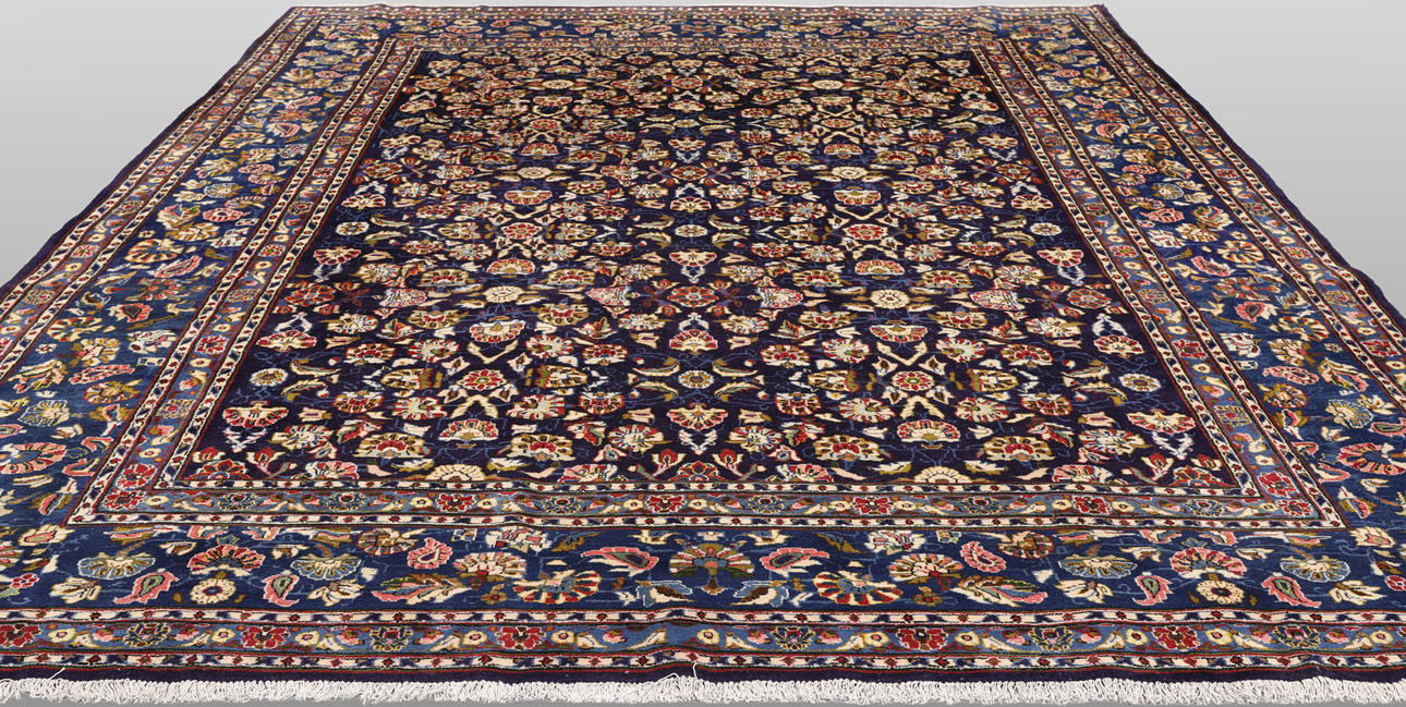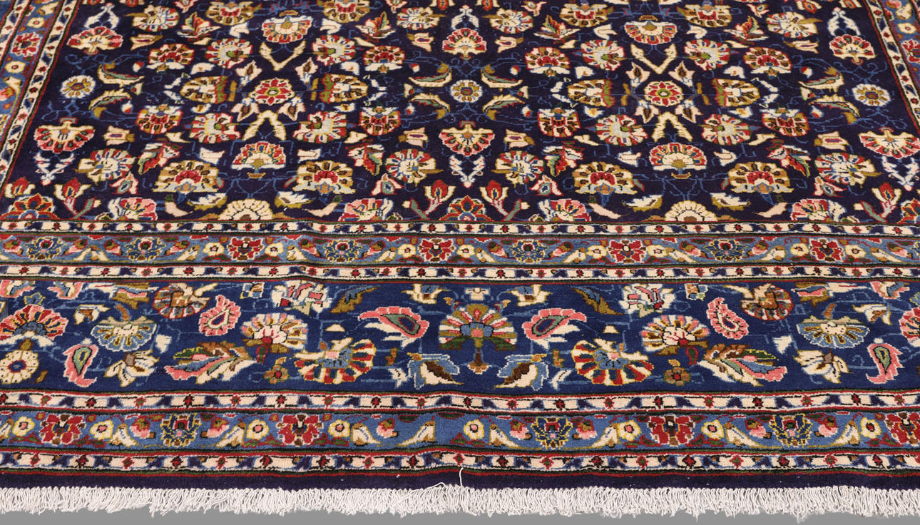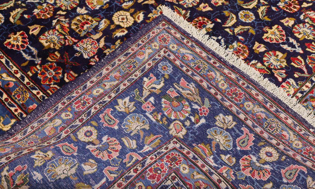 Elderly Keshan with dark blue bottom color and a center field covered with floral ornaments, palmettes and arabesques in blue, beige and red details. The border has a slightly lighter blue base and decoration of palm branches. The forelock is made of wool and the warp is of cotton.