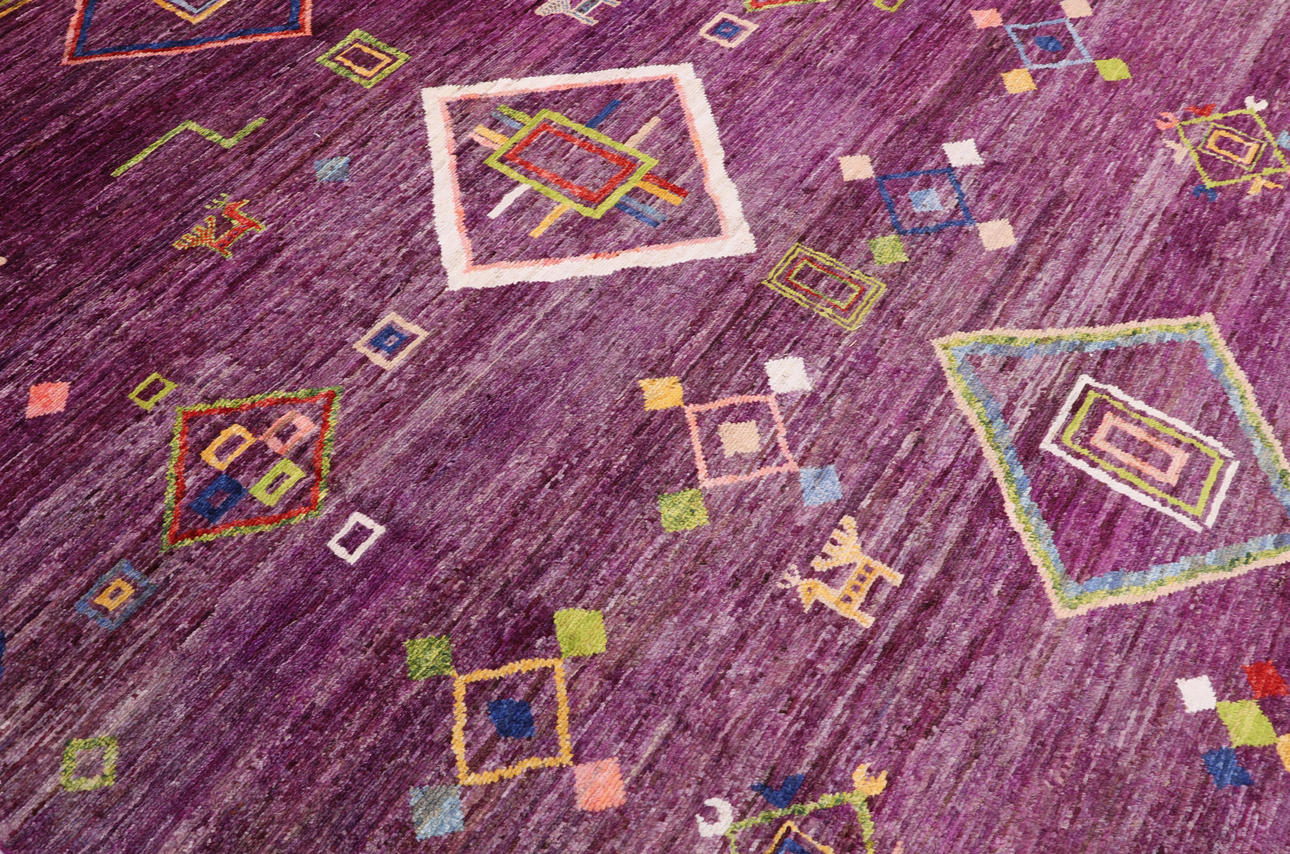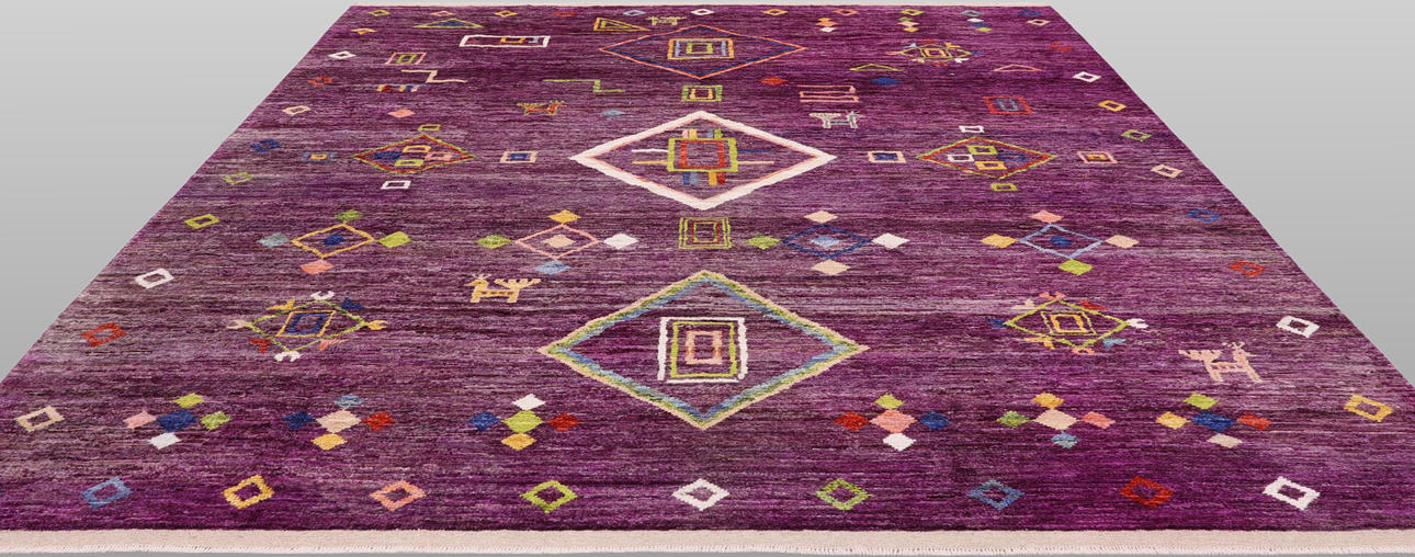 Figural Morocco with burgundy base and decor of stylized figures and geometric motif in polychrome color scale. The center field is dominated by larger rhombus shapes and scattered symbol motifs. Smaller ornaments are repeated over the entire surface. The bangs are made of wool and the warp cotton, approx. 295x256 cm.