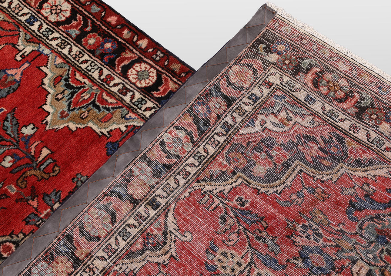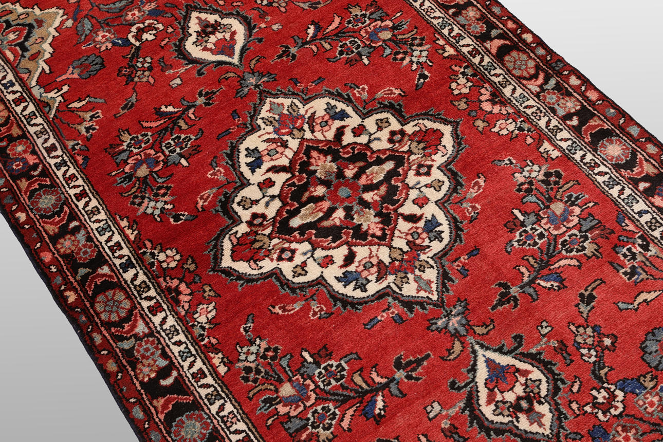 Hamadan gallery model with red base color and a central medallion in beige, black and red. The center field is decorated with floral ornaments in similar shades. The border has a dark base with floral decor. The forelock is made of wool and the warp is of cotton.