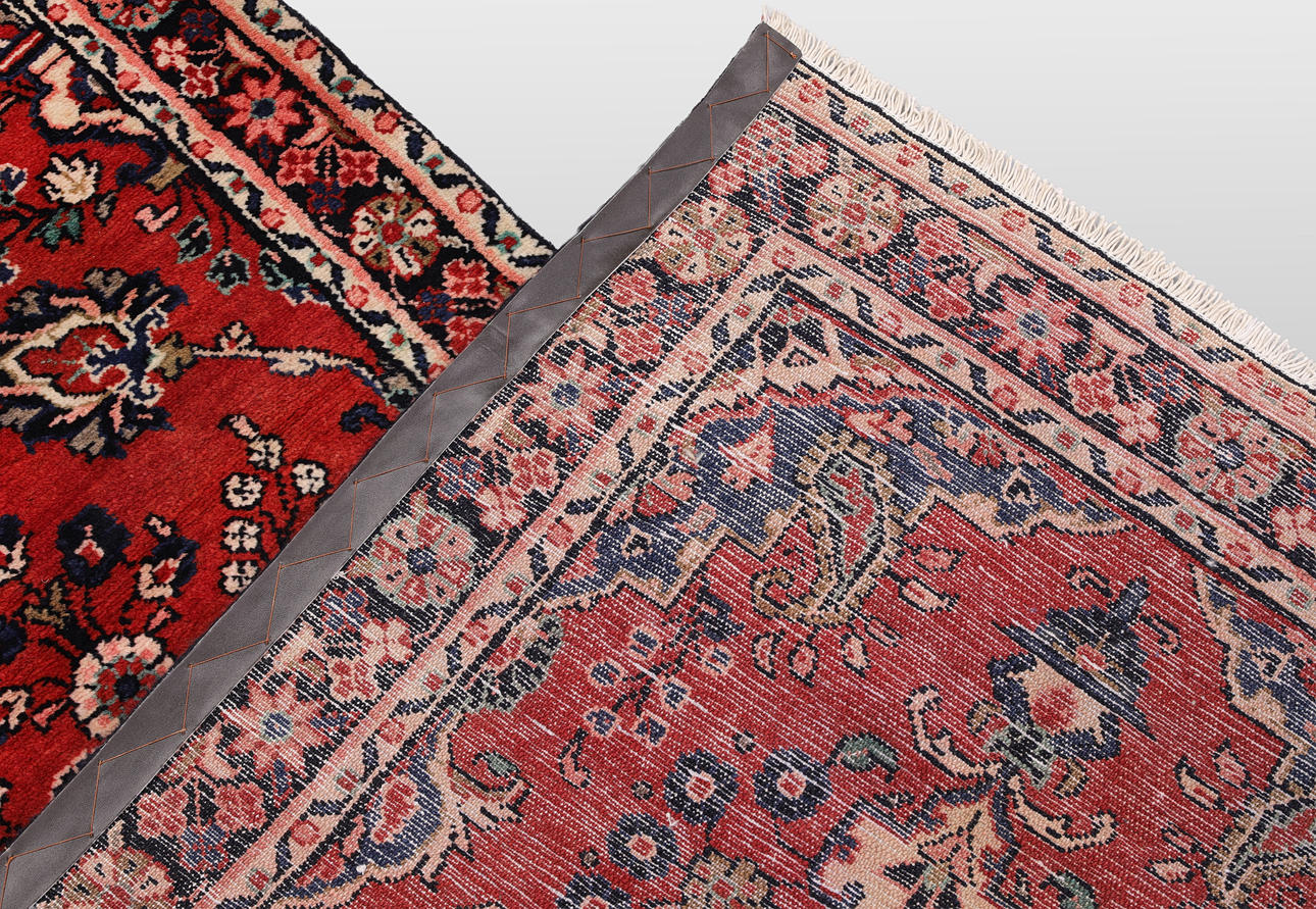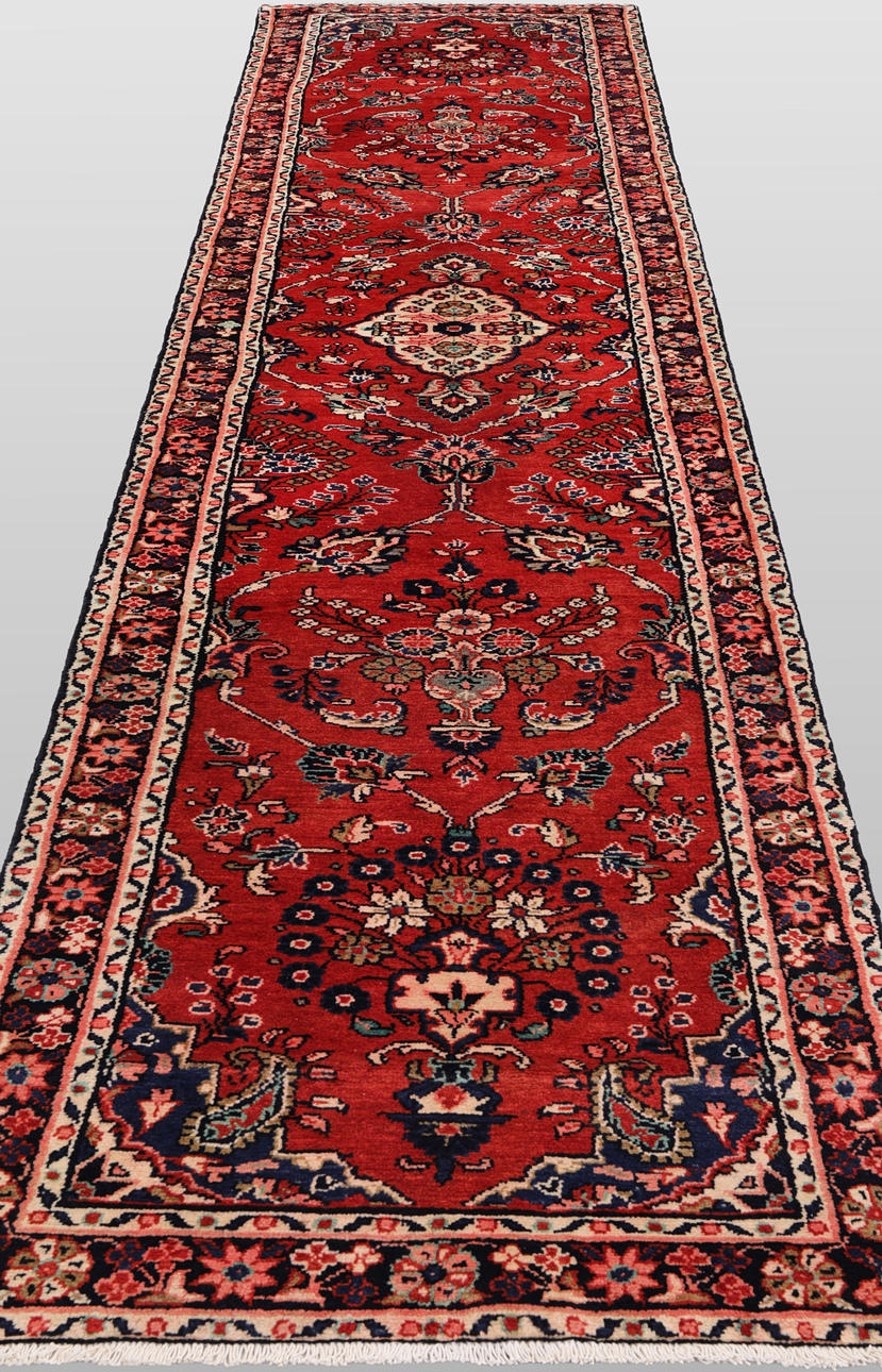 Hamadan gallery model with red base color and a central medallion in beige, red and pink details. The center field is decorated with floral ornaments and palmettes of similar shades. The border has a dark base with floral decor. The forelock is made of wool and the warp is of cotton.