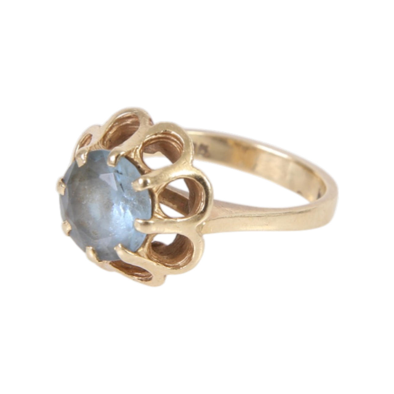 14kt gold ring with light blue synthetic stone.