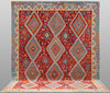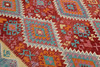 Hand-woven Kelim in classic design with red bottom color and geometric pattern in polychrome color scale.