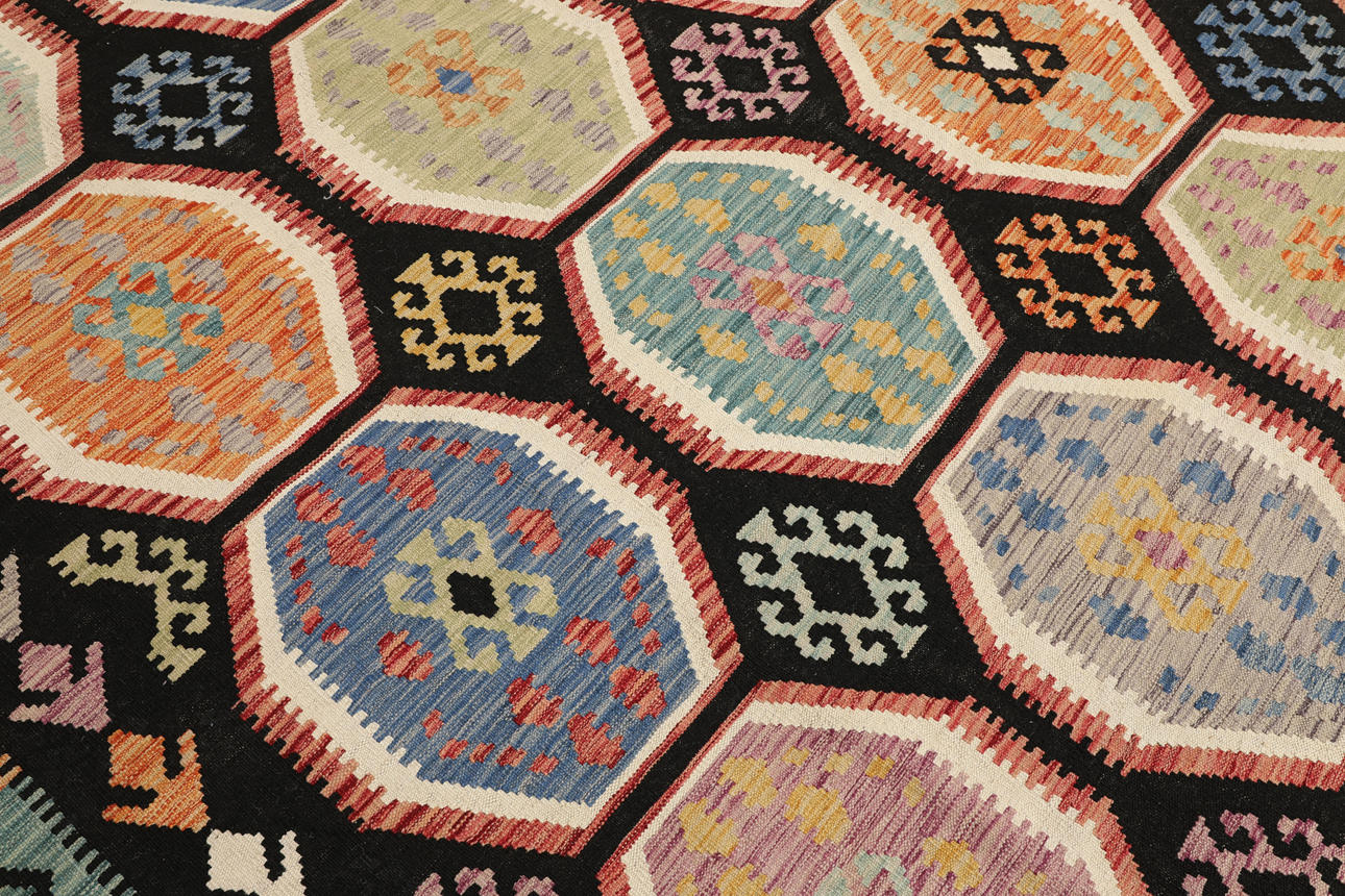 Hand-woven Kelim in classic design with black bottom color and geometric pattern in polychrome color scale.