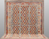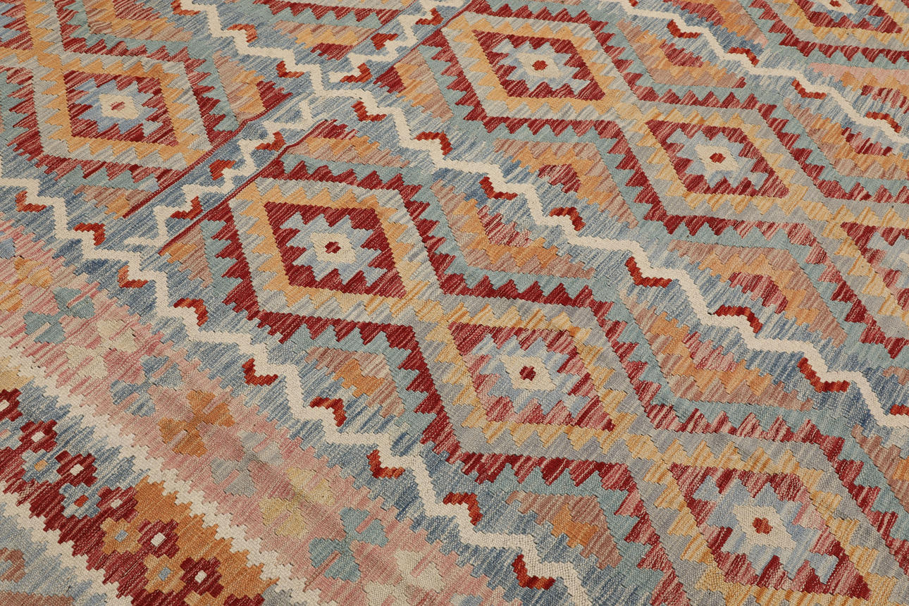 Hand-woven Kelim in classic design with geometric pattern in polychrome color scale.