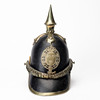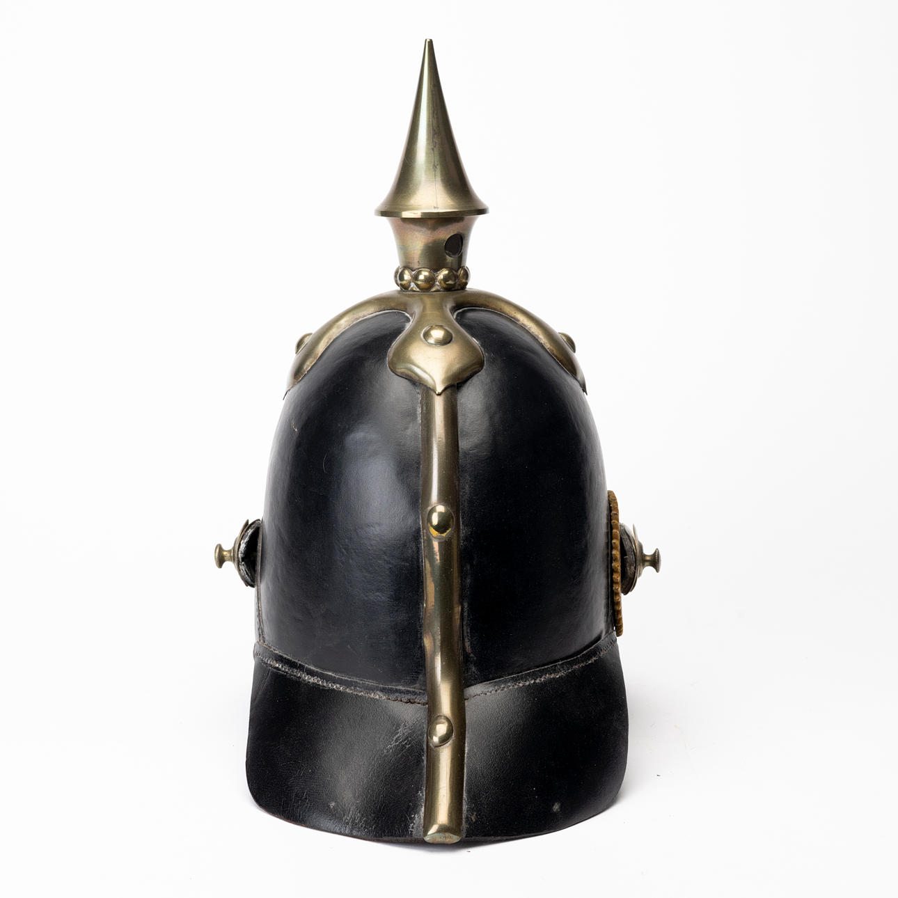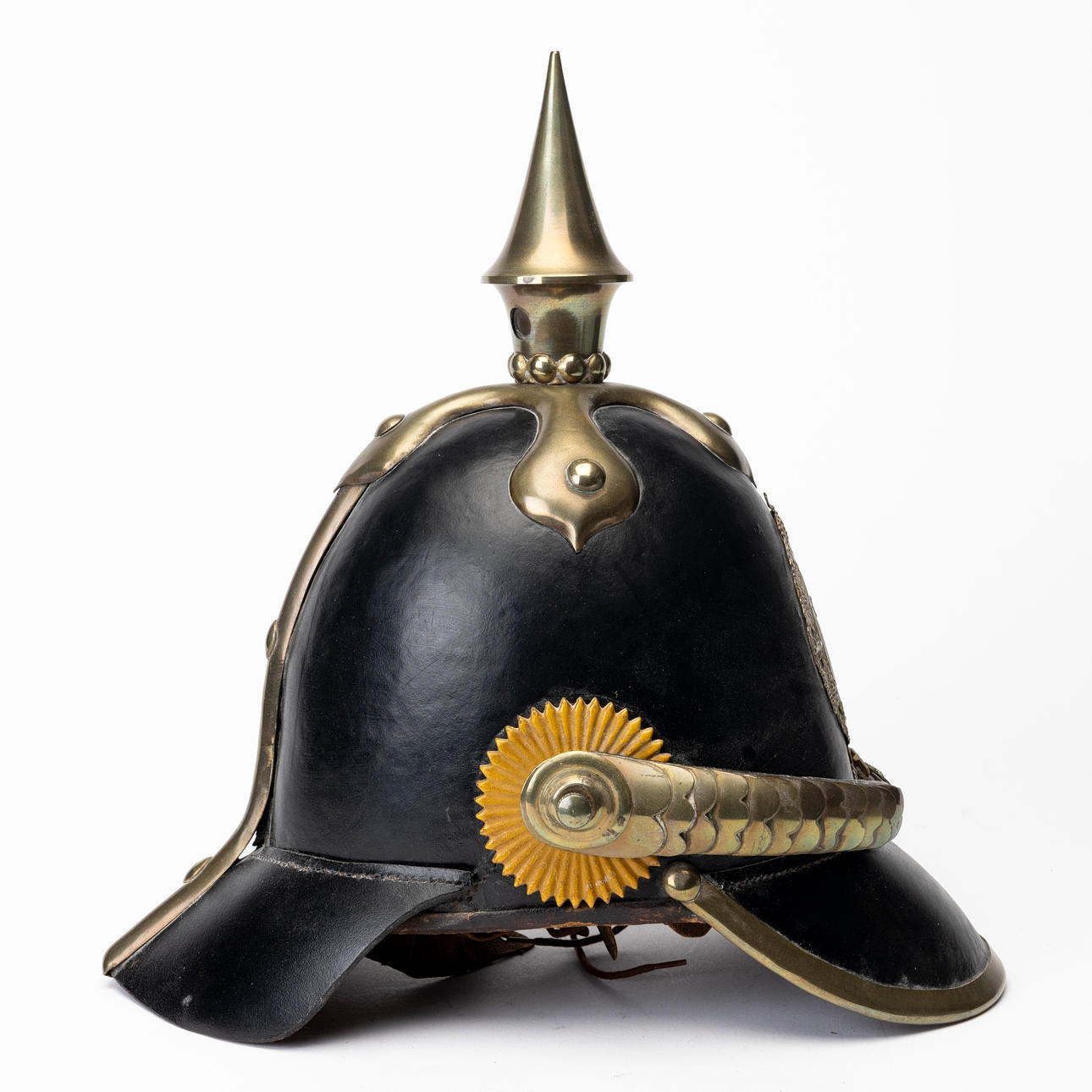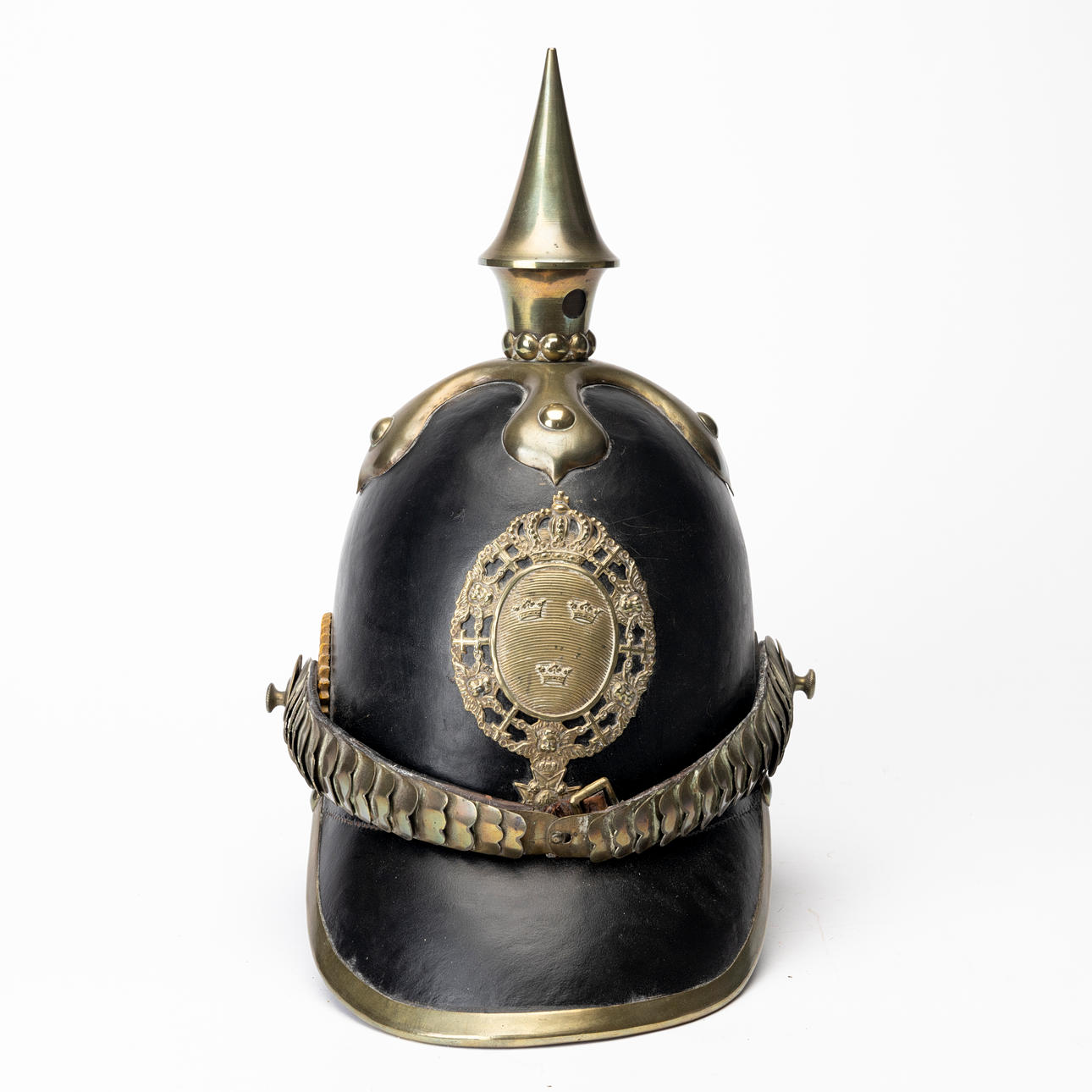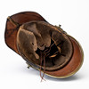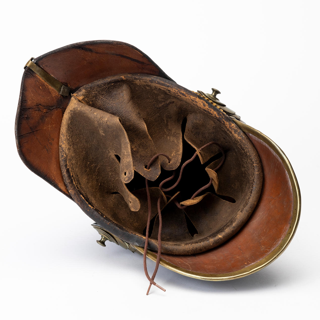 Usage and age-related wear. Later string on the inside. Dry crack. Leather on chin strap with damage.