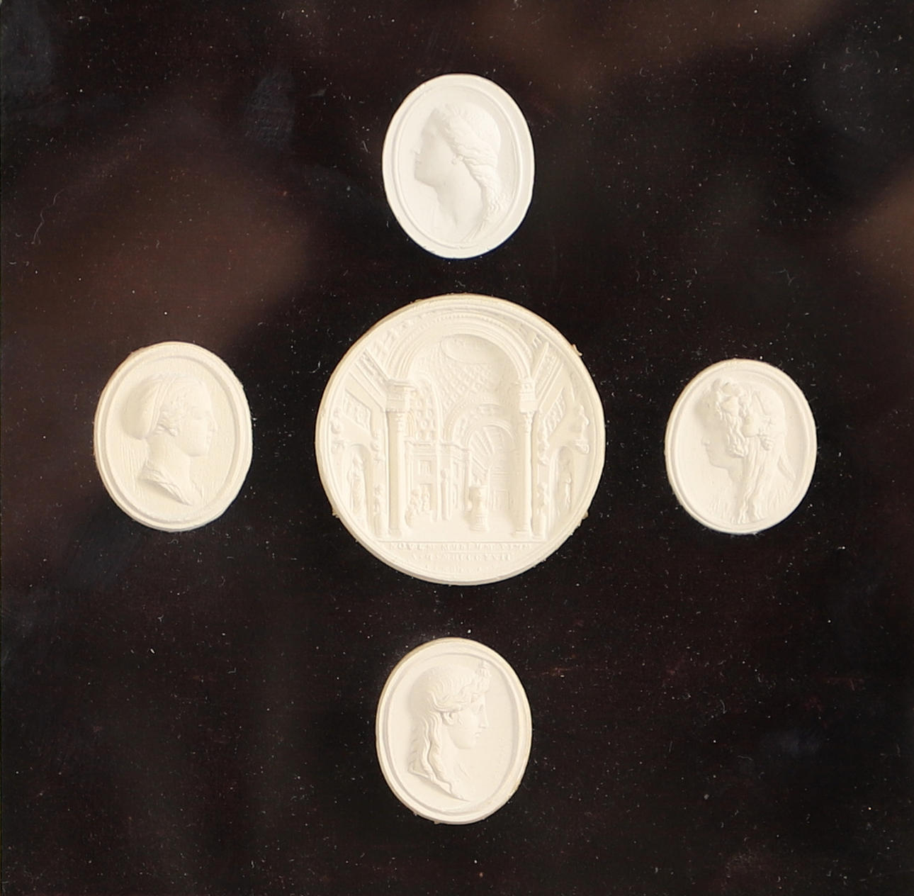 probably nineteenth century, each depicting Classical figures and Cities, later framed and glazed, 20cm x 20cm overall.