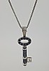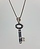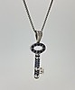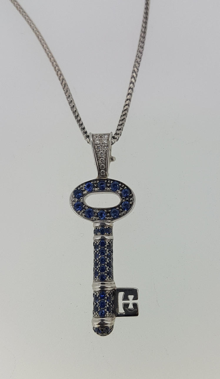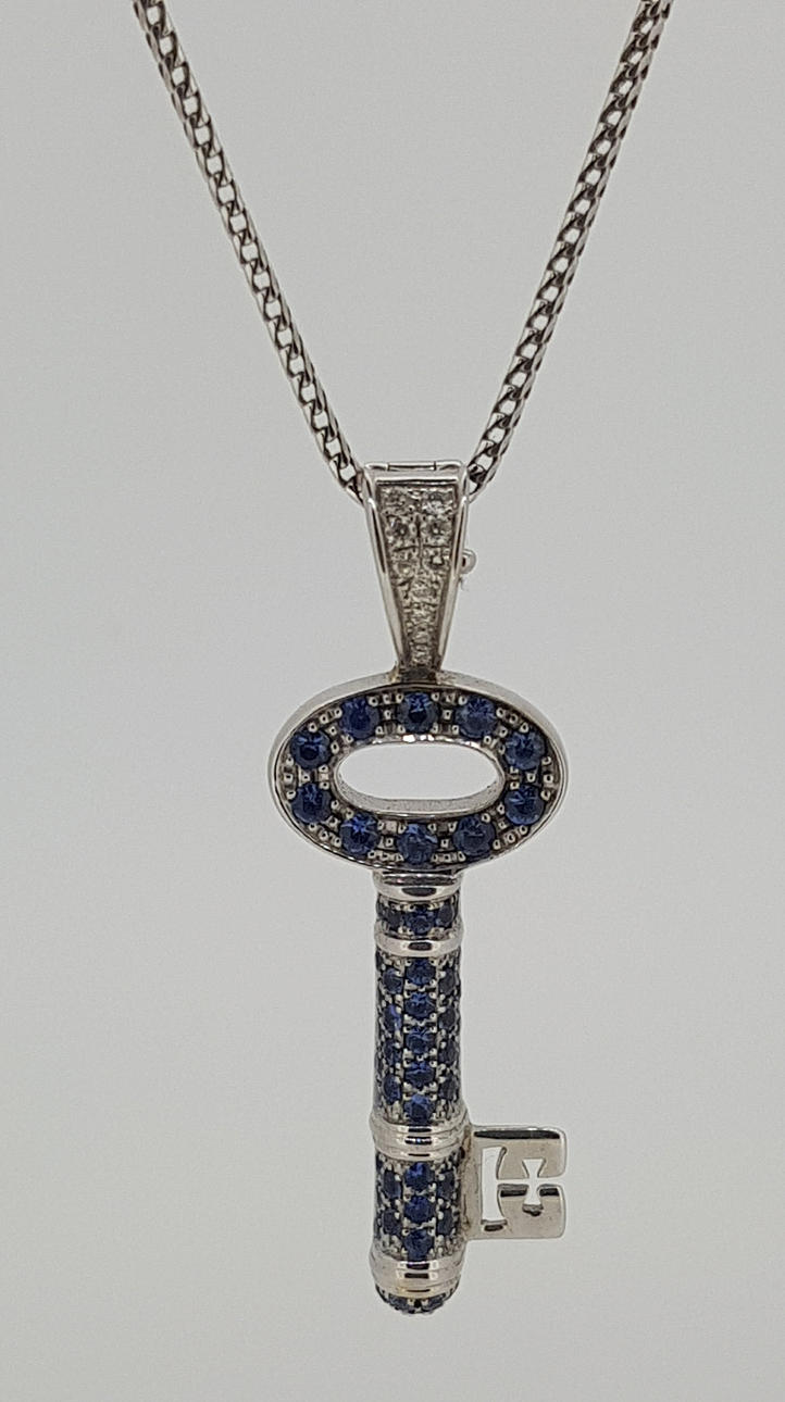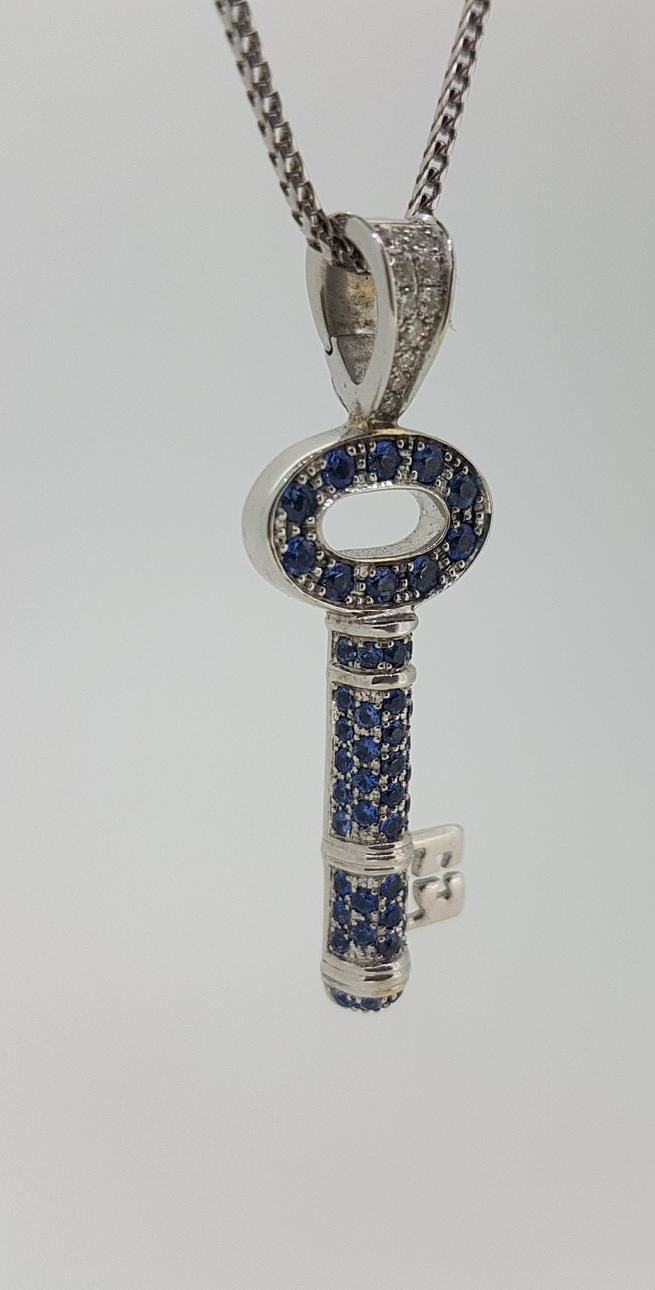 The pendant is set with round brilliant cut diamonds and round brilliant cut natural sapphires.