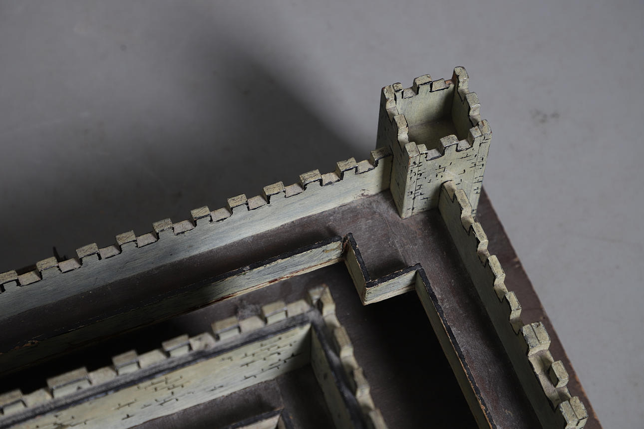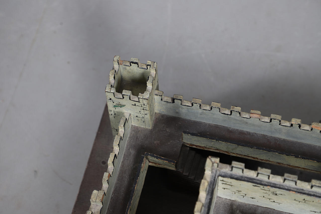 on rectangular foundations, with painted detailing and drawbridge, 58cm x 38cm x 30cm.