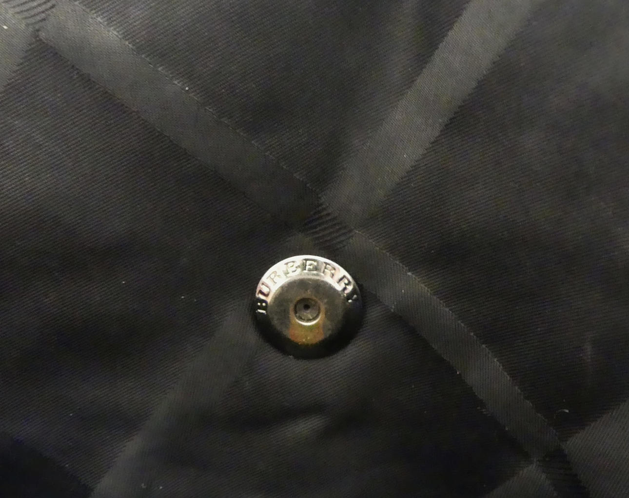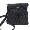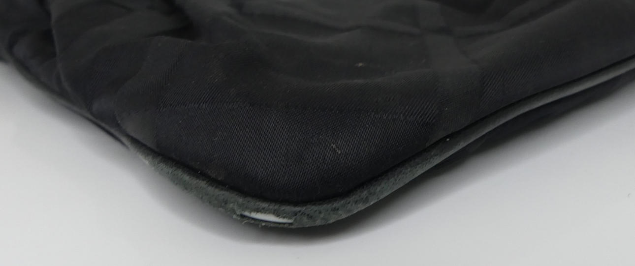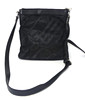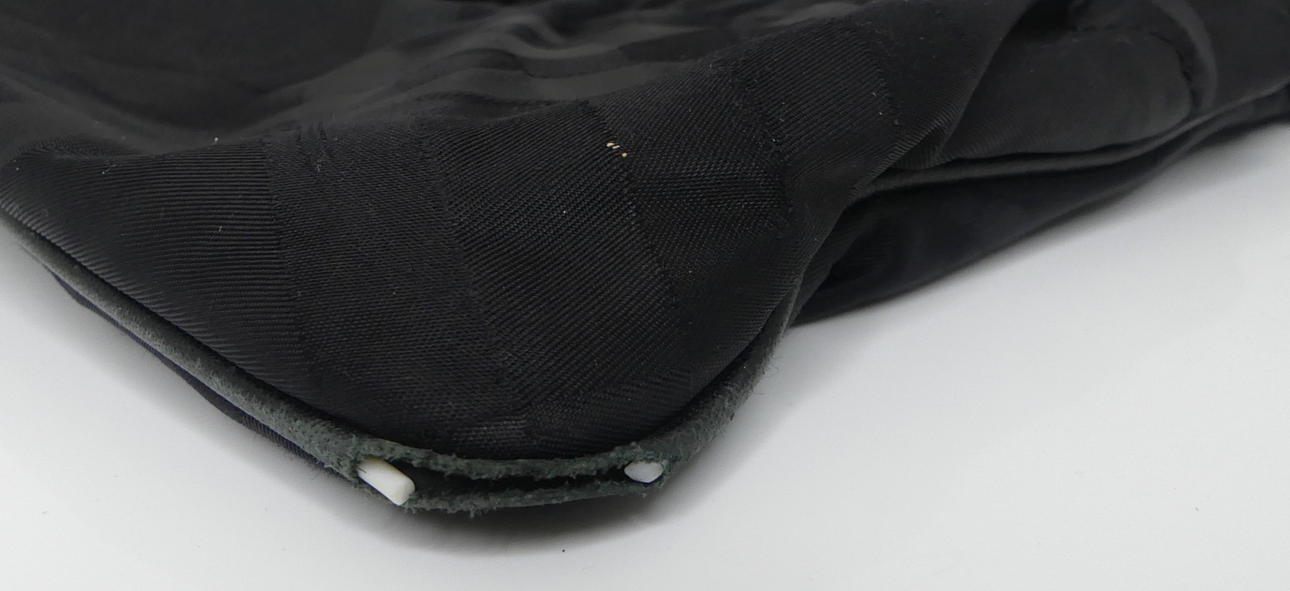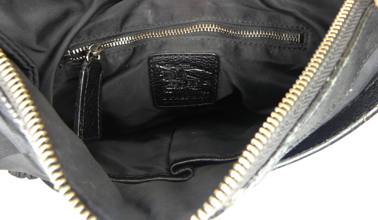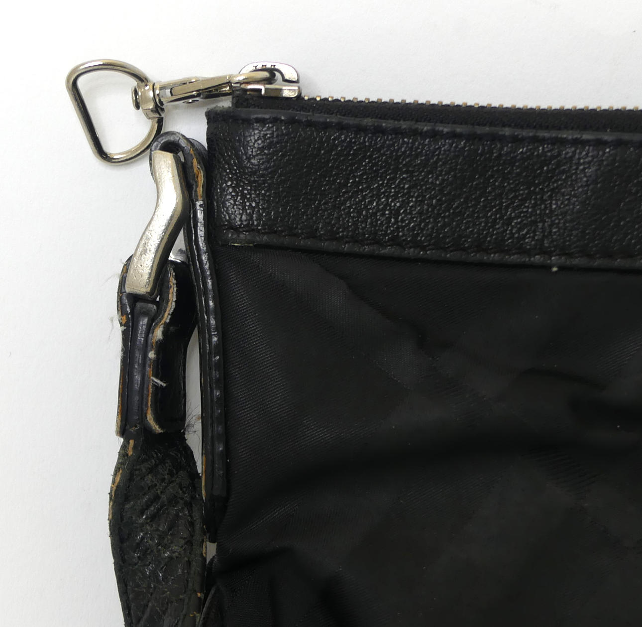 Outer pocket with push button at the front. inner pocket with zipper, also two smaller compartments on the inside. Nylon and leather. Height 28 cm, width 25 cm. Maximum dimensions with carrying strap 91 cm.