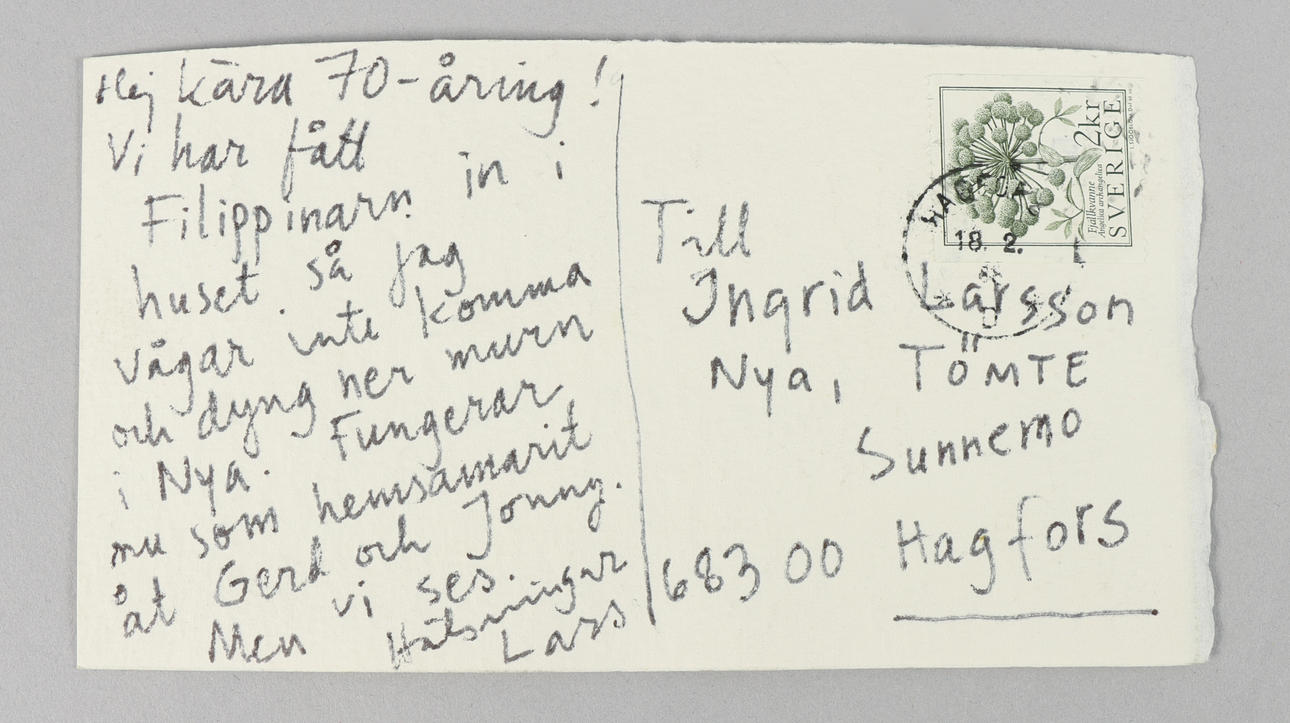 “Hello dear 70-year-old! We've got Filipinarn into the house so I don't dare come and hang down the wall in Nya. Now serving as a home samaritan for Gerd and Jinny, but see you. Greetings Lars”