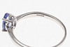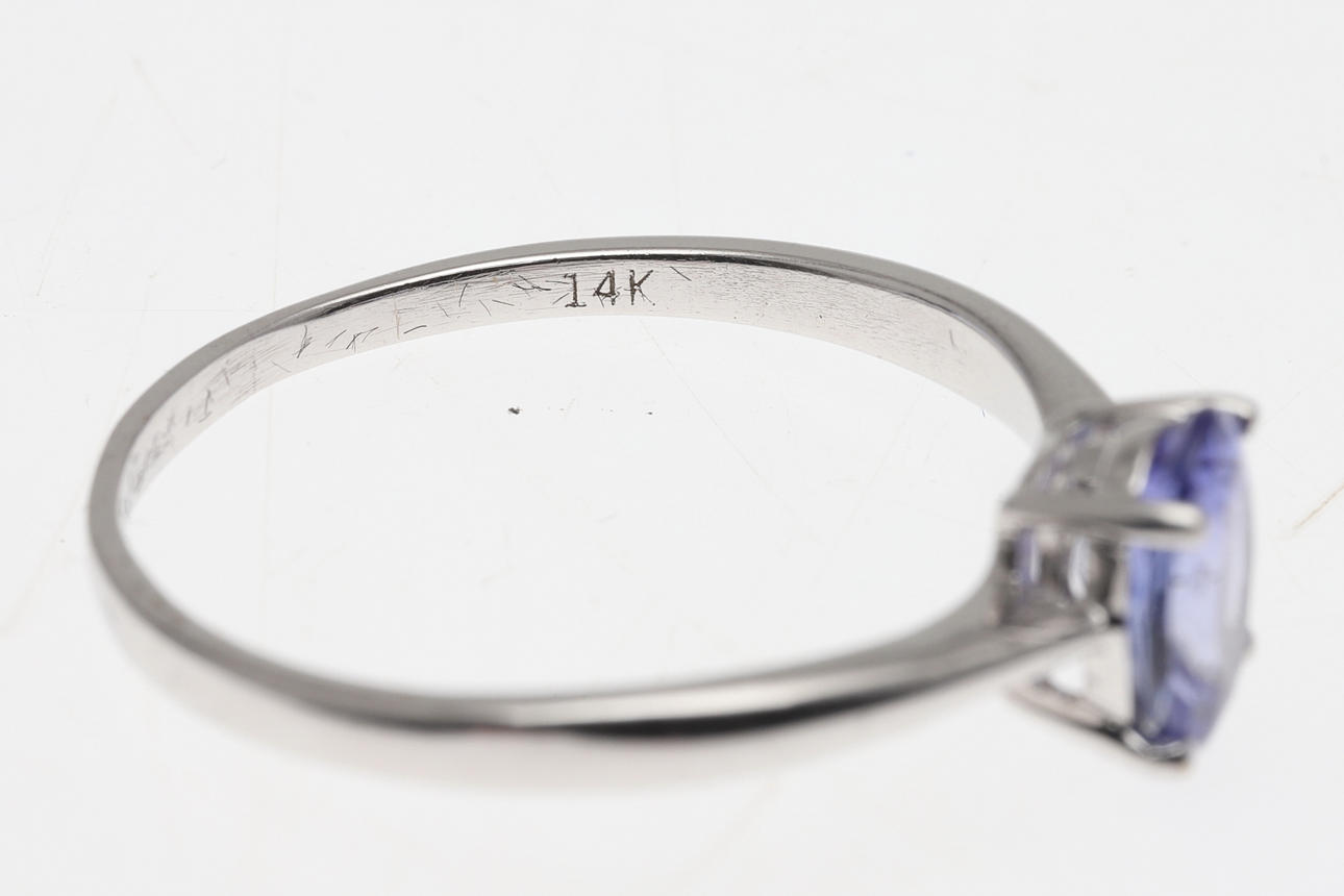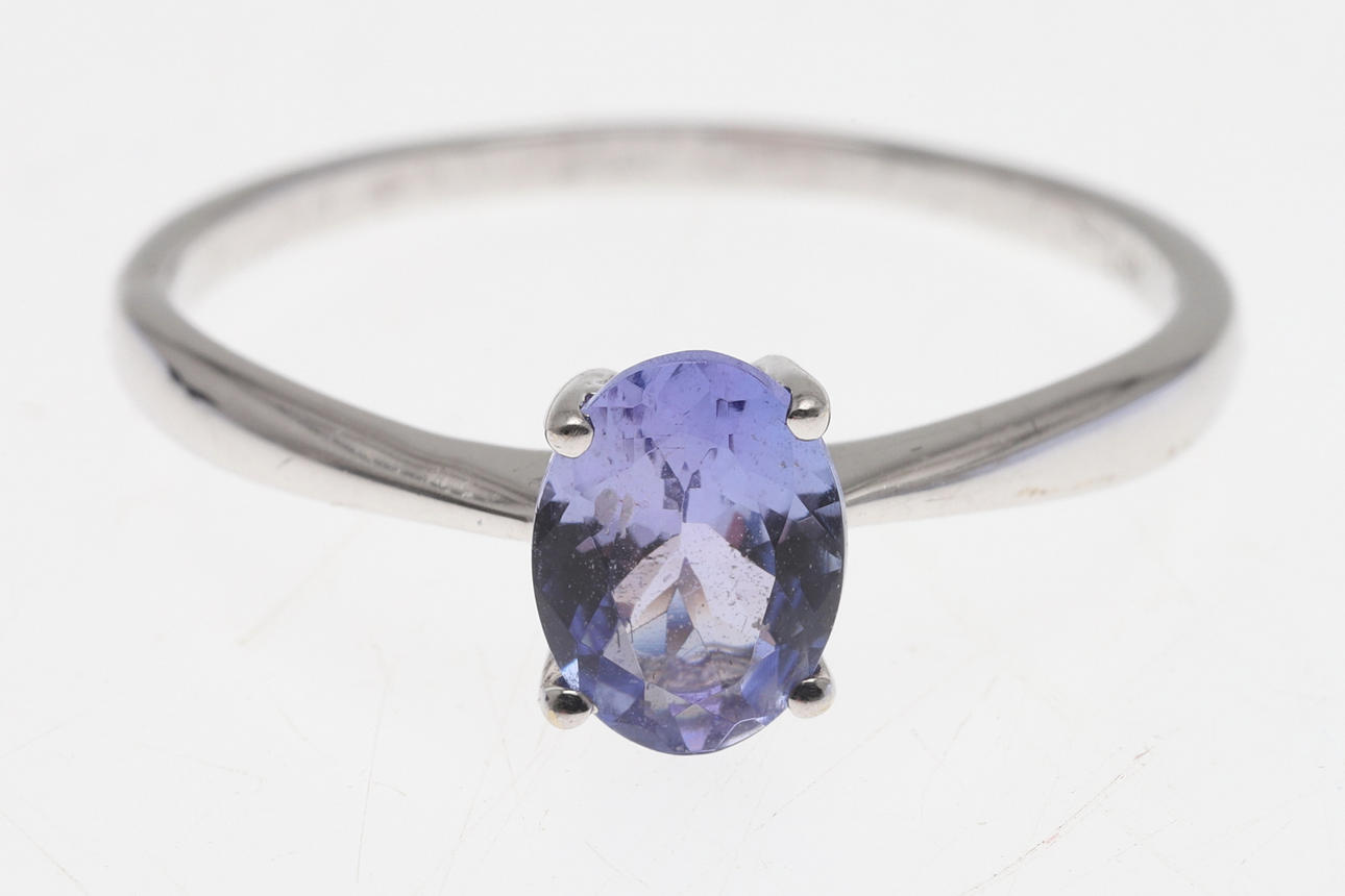the oval-shaped tanzanite is claw set in 14ct white gold, 2.1 grams. Size Q 1/2.