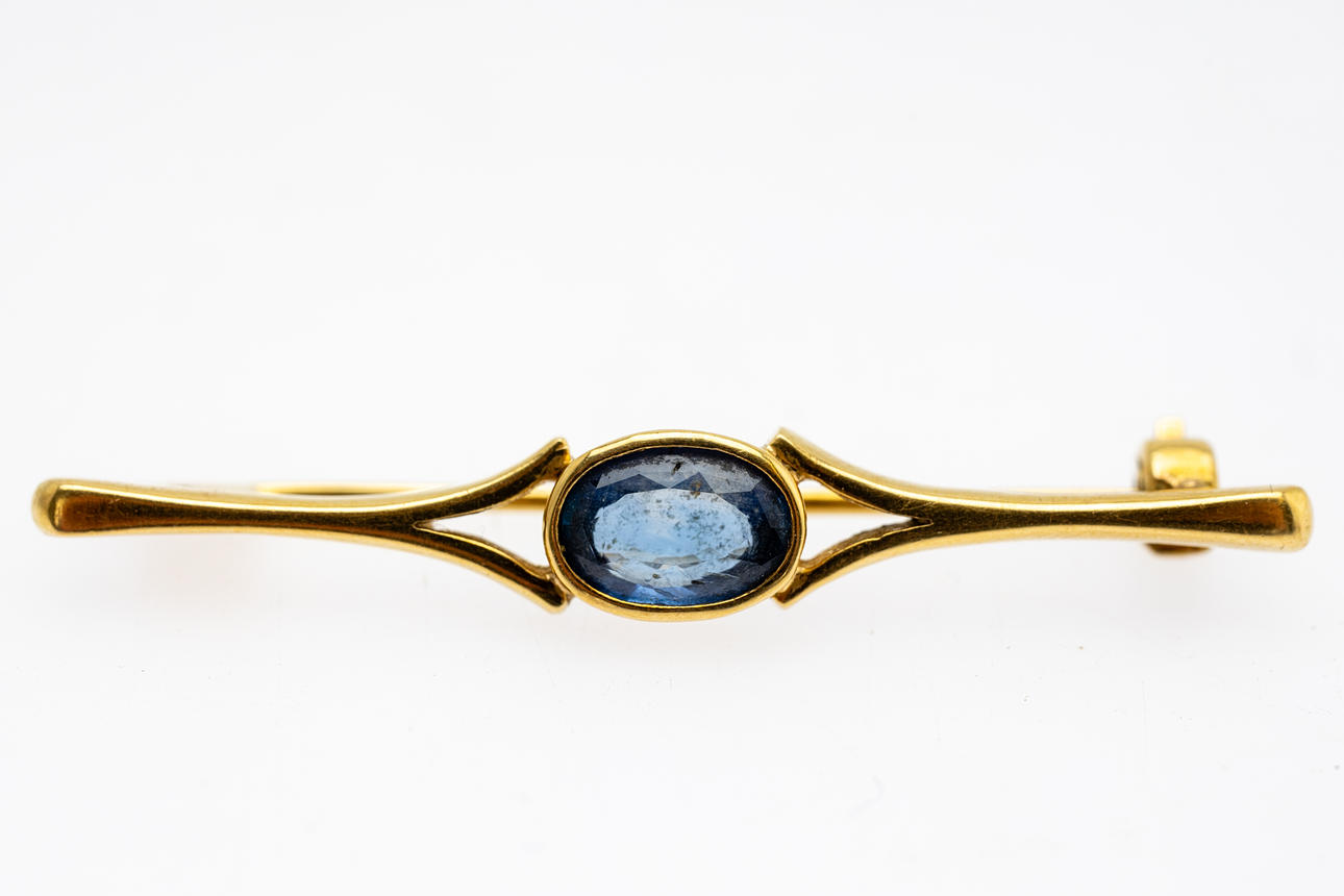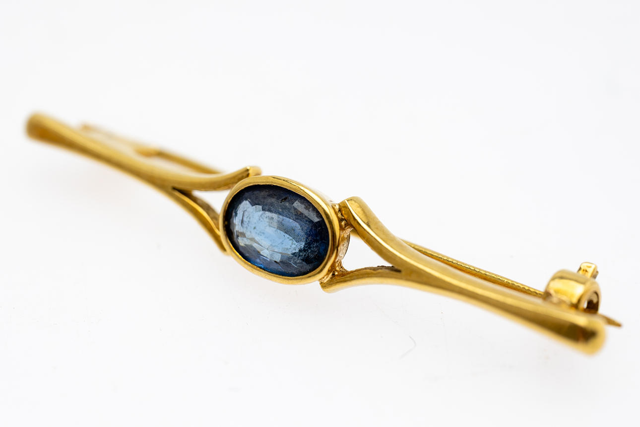 1 brooch made of 585 gold, set with cultured pearls and two diamonds. 1 brooch made of 750 gold, set with a sapphire.