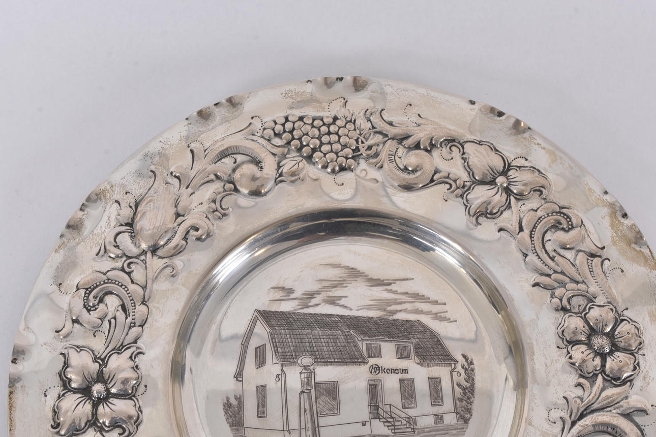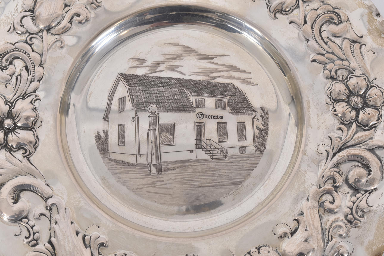decoration of acanthus, etc., and engraving by MP Konsumaffär (!), dia 28,5, weight 326 grams.