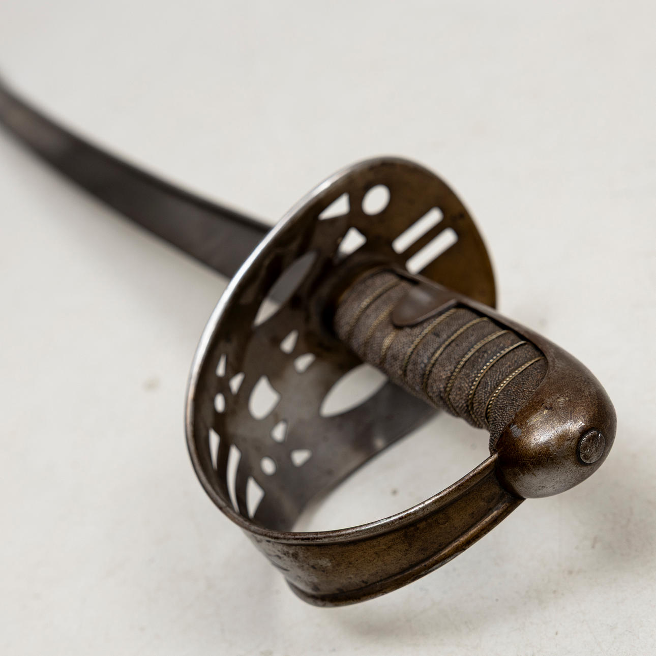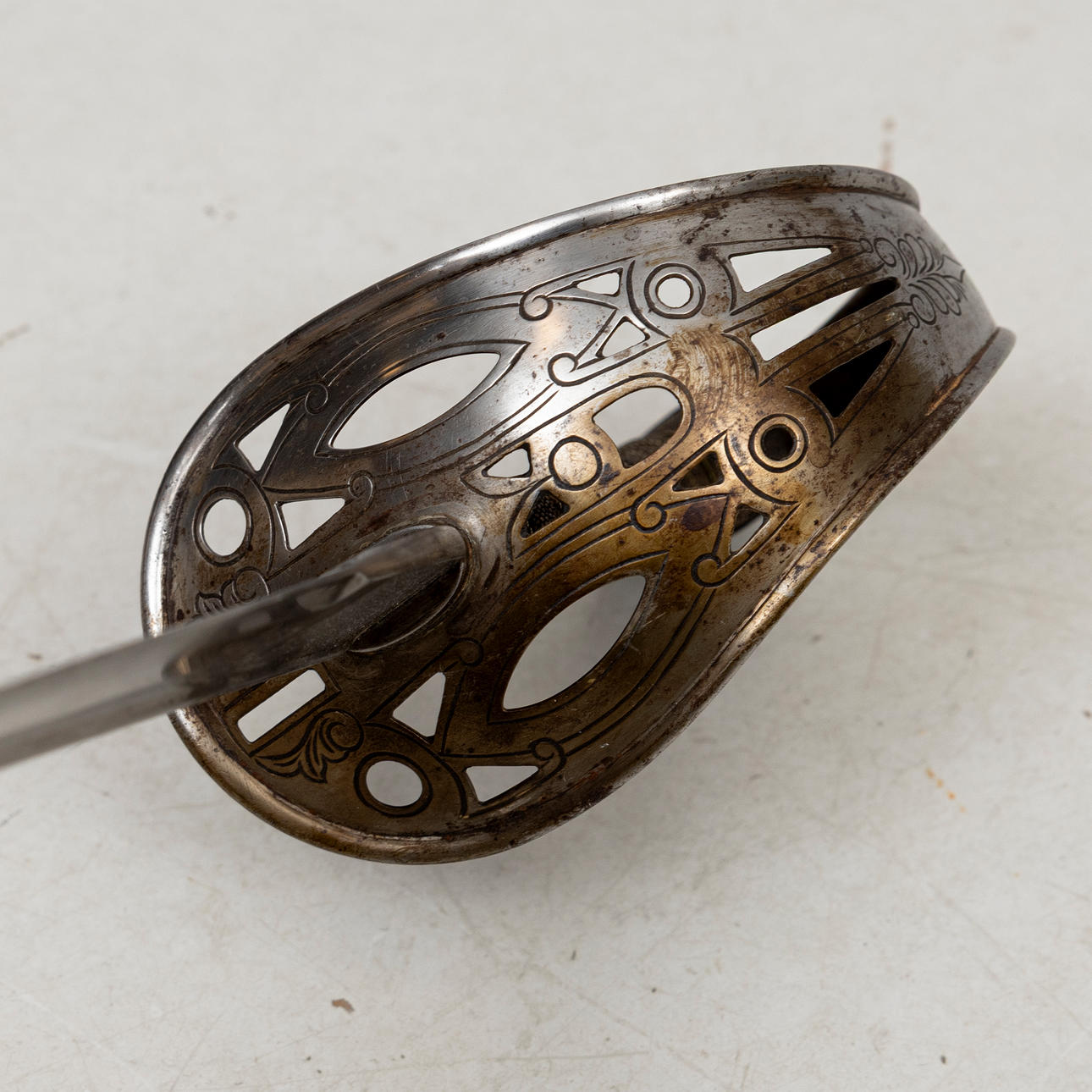 Steel bracket with openwork decor. Slightly curved blade, mostly single-edged and has a reinforced, rounded back.
