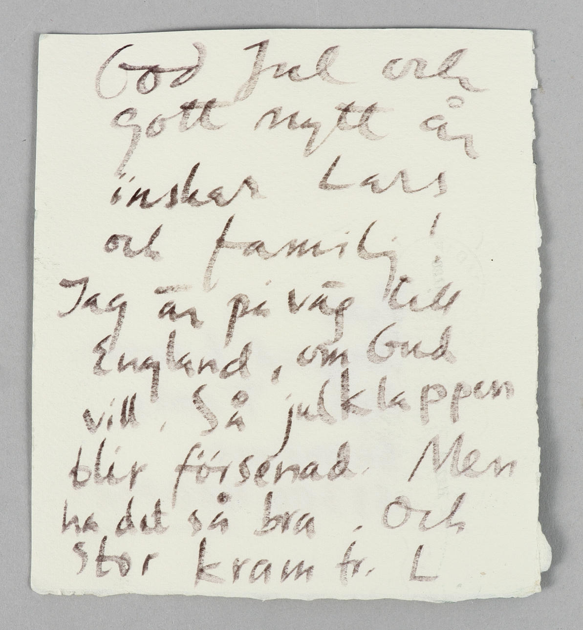 “Merry Christmas and Happy New Year wishes to Lars and family! I'm on my way to England, God willing. So the Christmas present will be delayed. But have it so good. And a big hug from L”