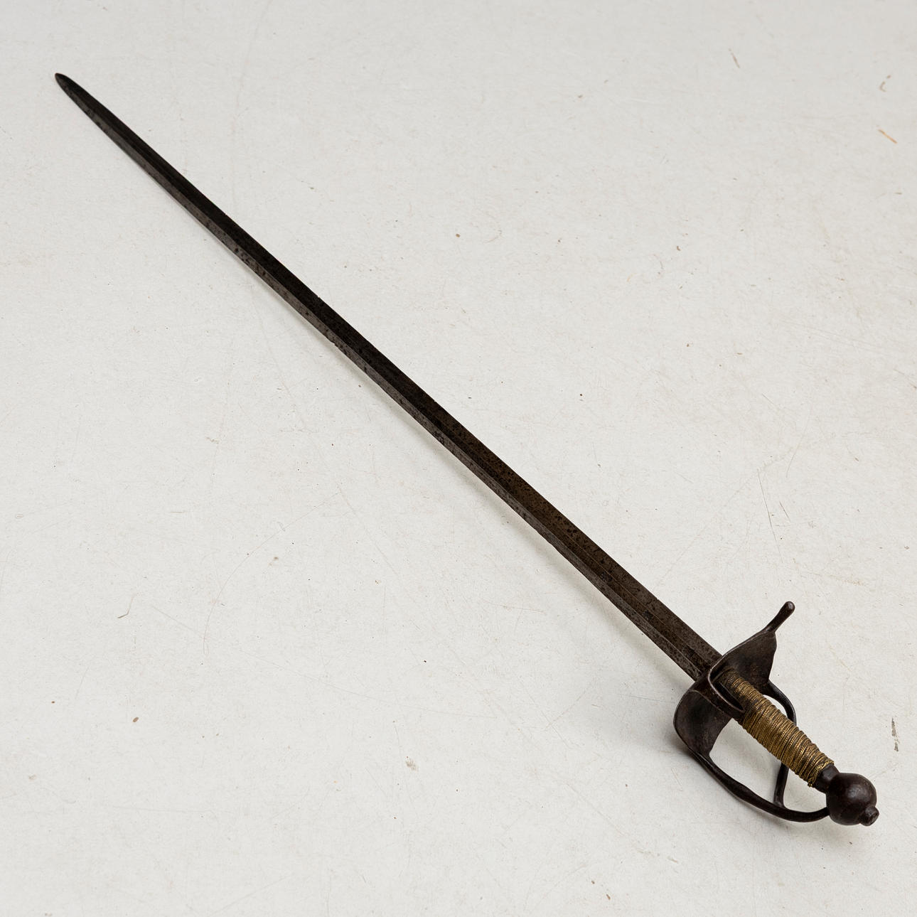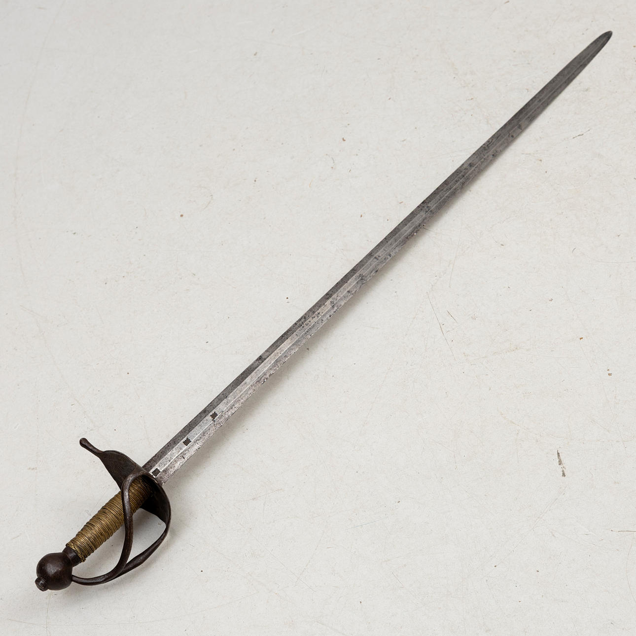 Bracket made of iron, rolling pin with braided brass winding, thumb jumper. Double-edged blade with flat ridge.