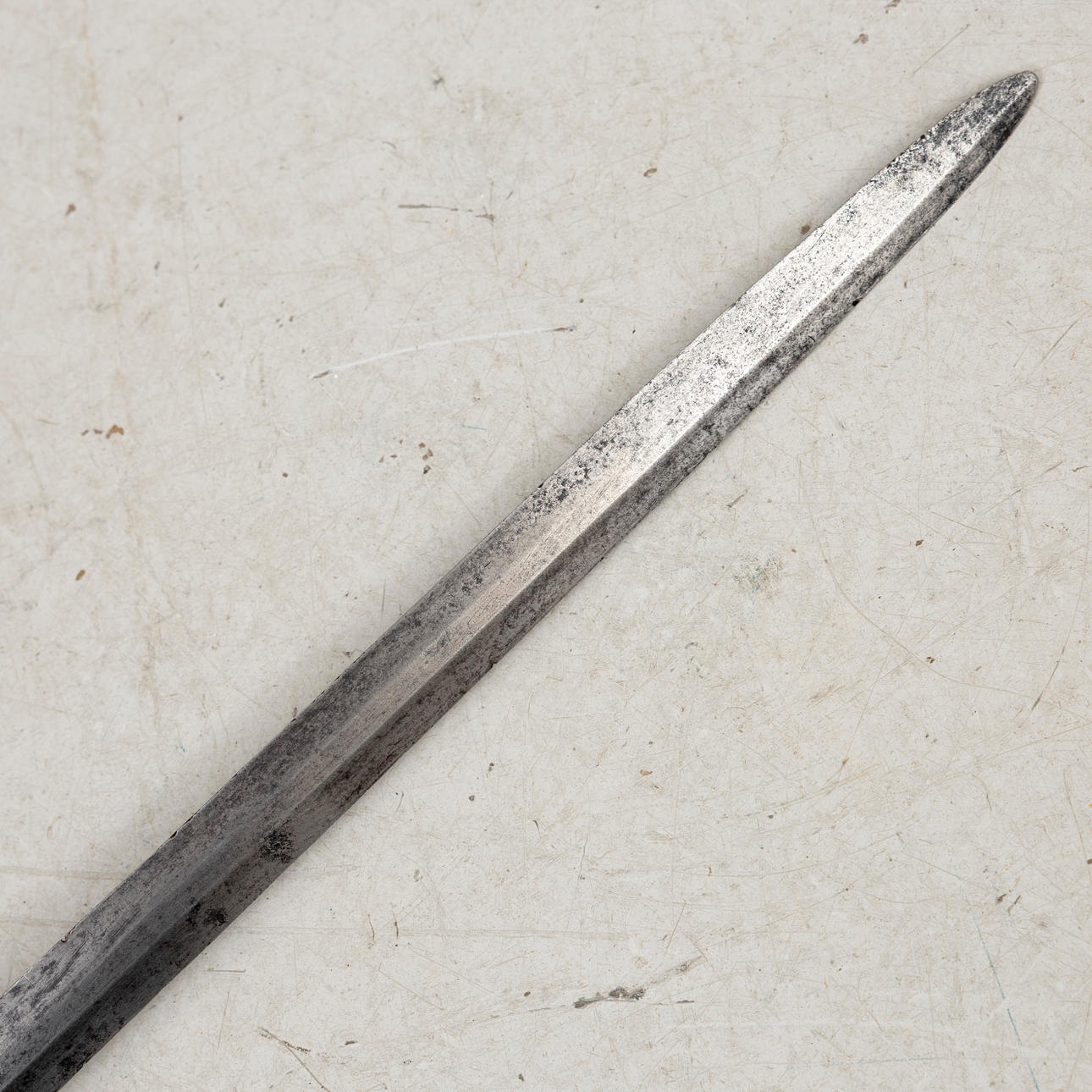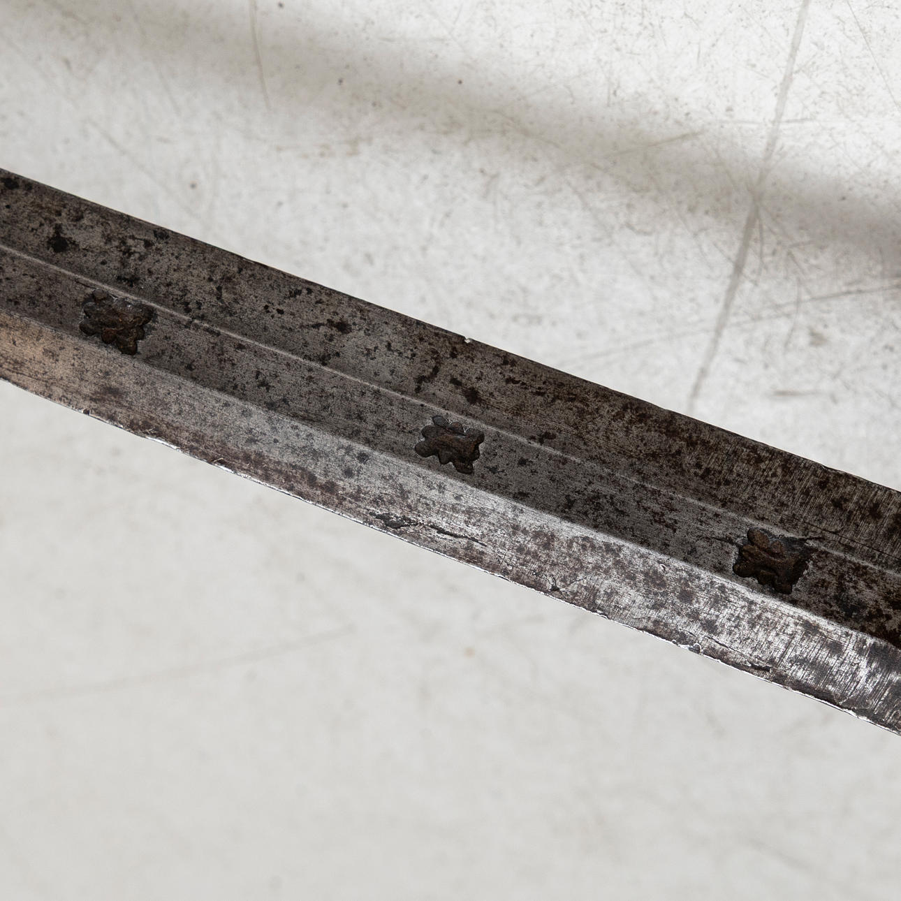 Blade does not match the width at the bracket of the current model (30.5 vs usually 35mm), possibly not original. Usage and age-related wear. Corrosion/rust. Blade with notch, sharpened tip.