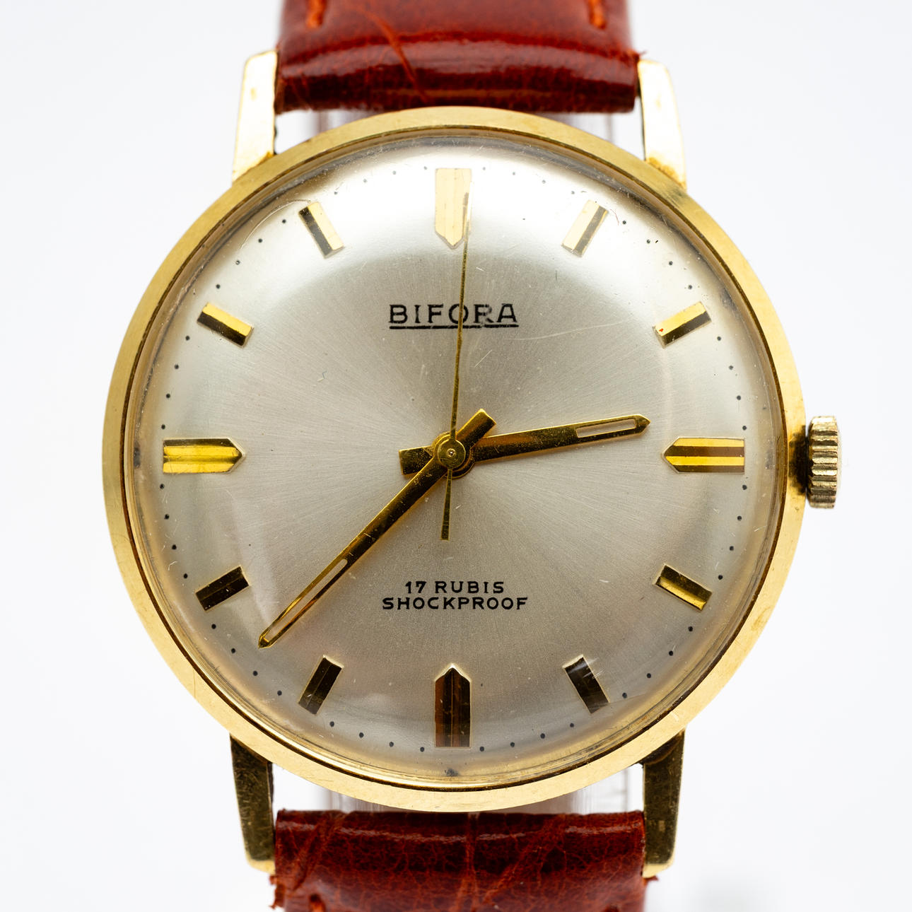 BIFORA wristwatch. 585 gold case, dial with hour, minute and second hand. manual lift. Dimensions approx. Case diameter 34 mm. Leather strap with pin buckle not from Bifora The clock was ticking at the time of the review, Stockholm's auction shop does not guarantee functionality.