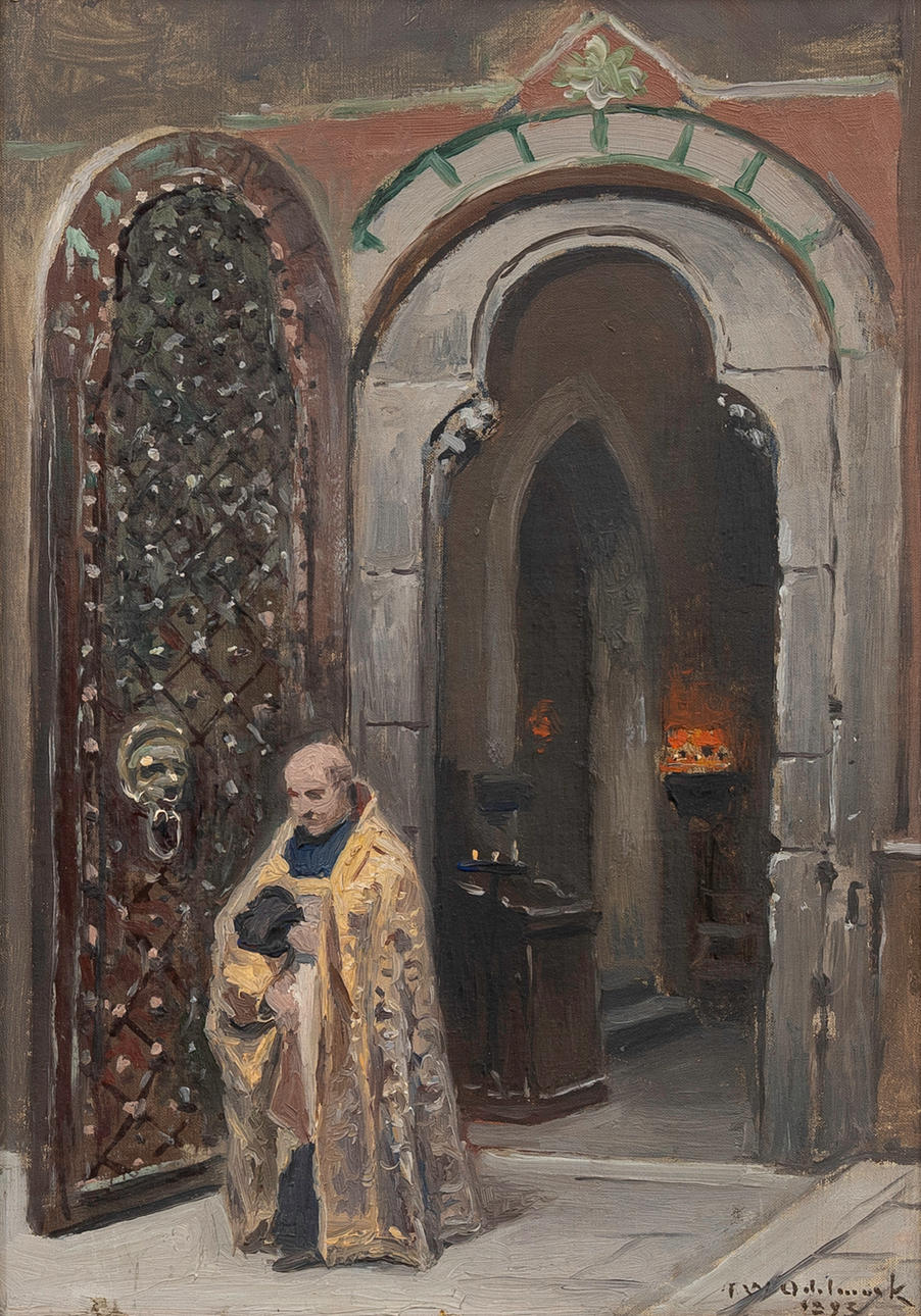 FRANS WILHELM ODELMARK. Priest at gate, oil on panel, signed, dated 1893.