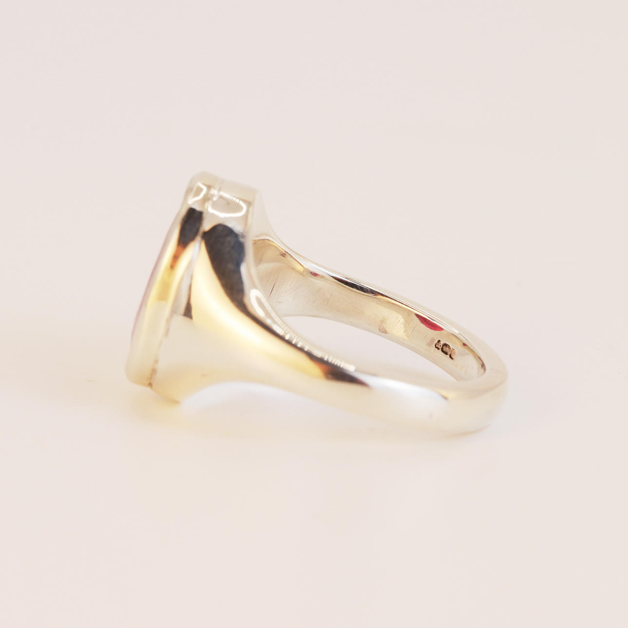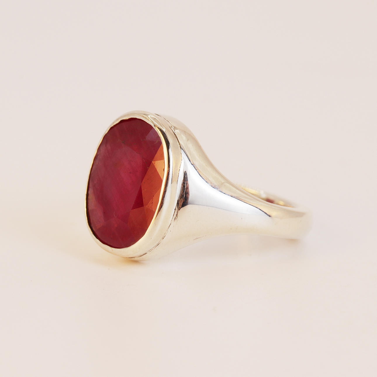 A hallmarked silver solitaire ring set with a large oval cut ruby, approx. 7ct, UK ring size R.5.