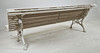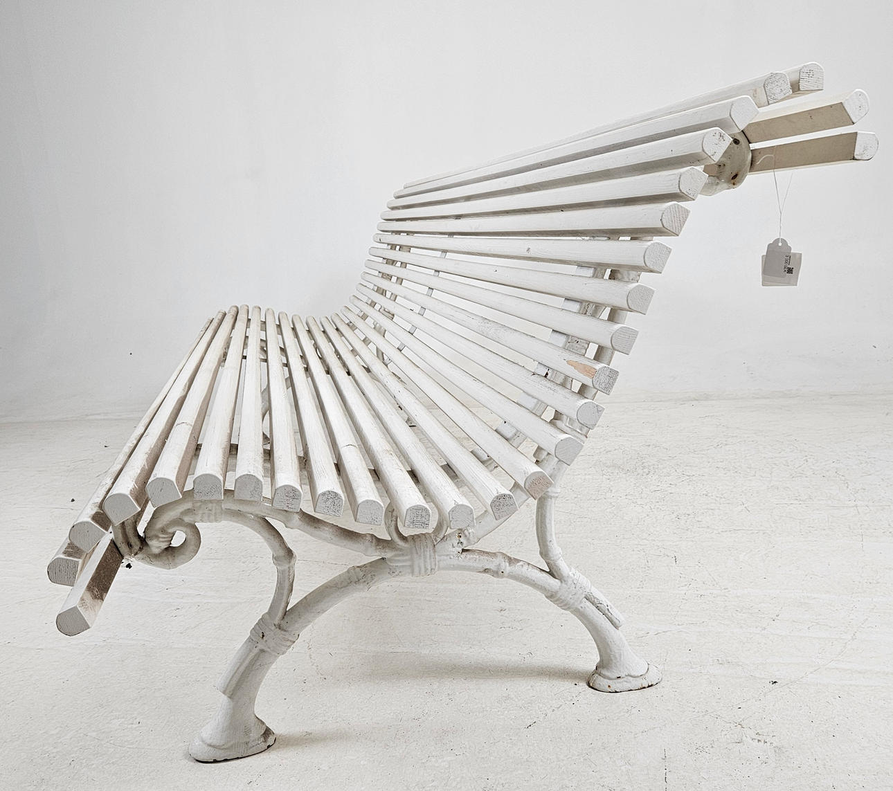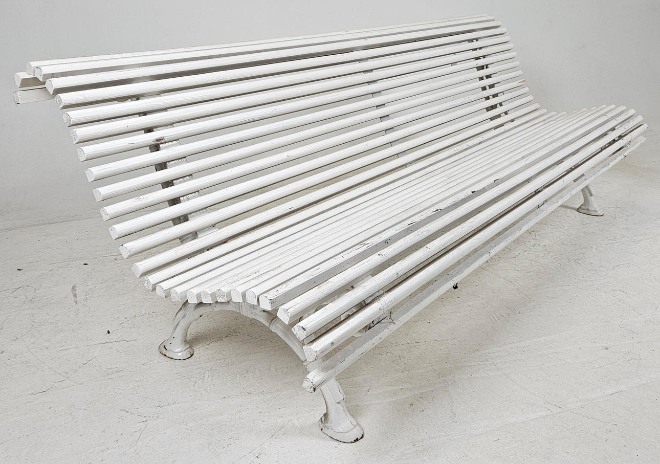 Cast iron gables and wooden slats, painted.