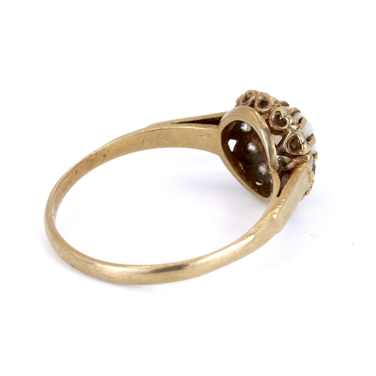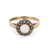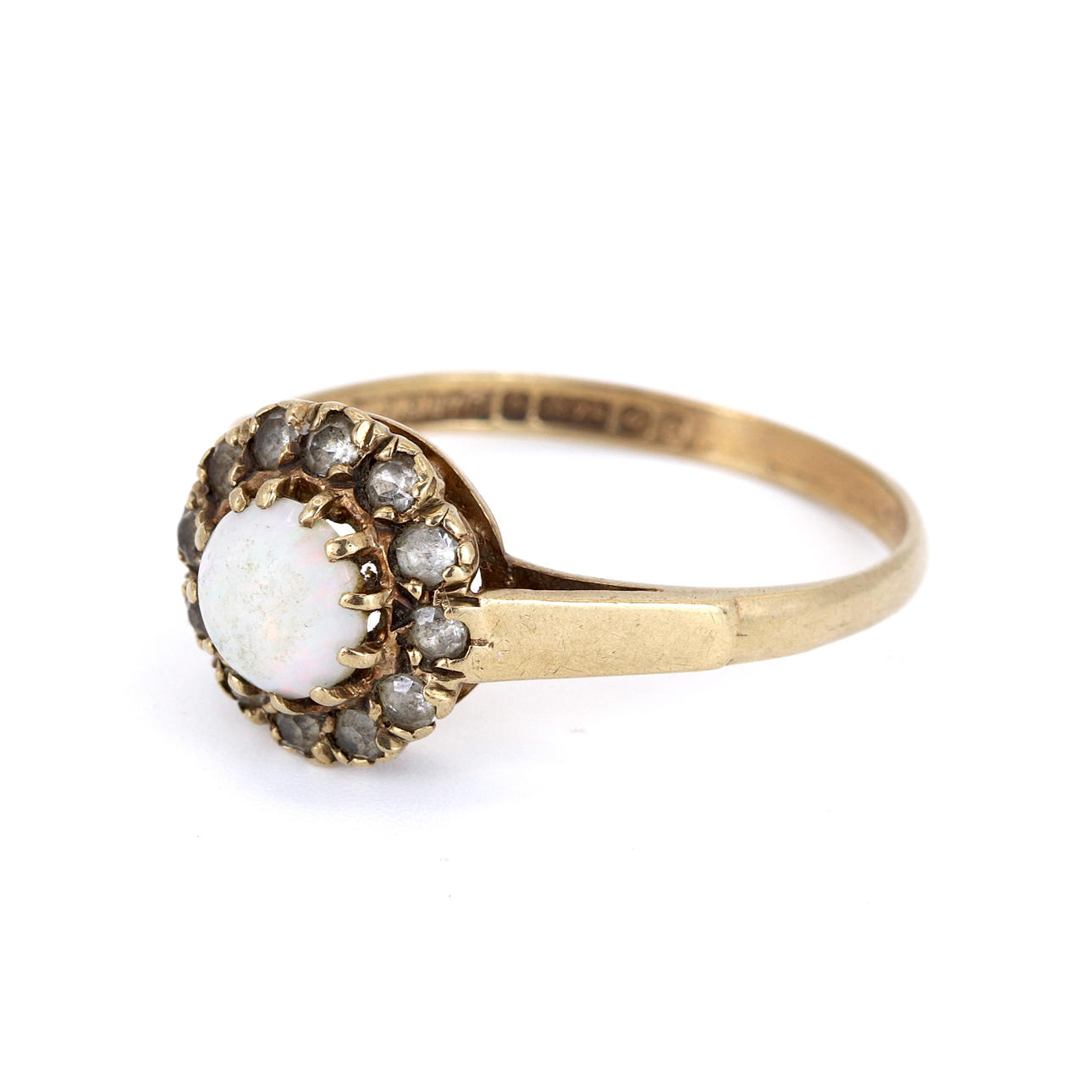 A 9ct yellow gold ring set with round cut opal surrounded by white stones. UK ring size: R.