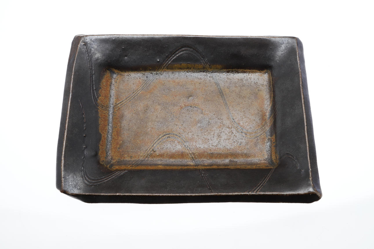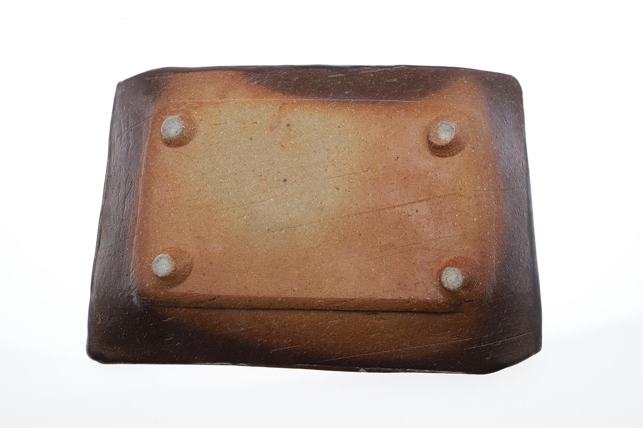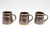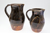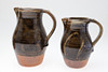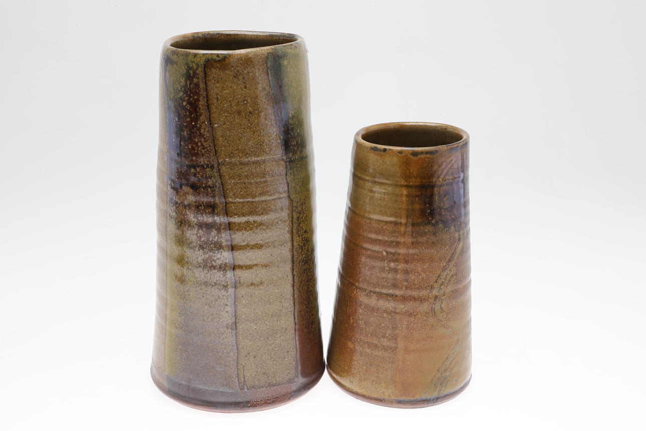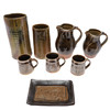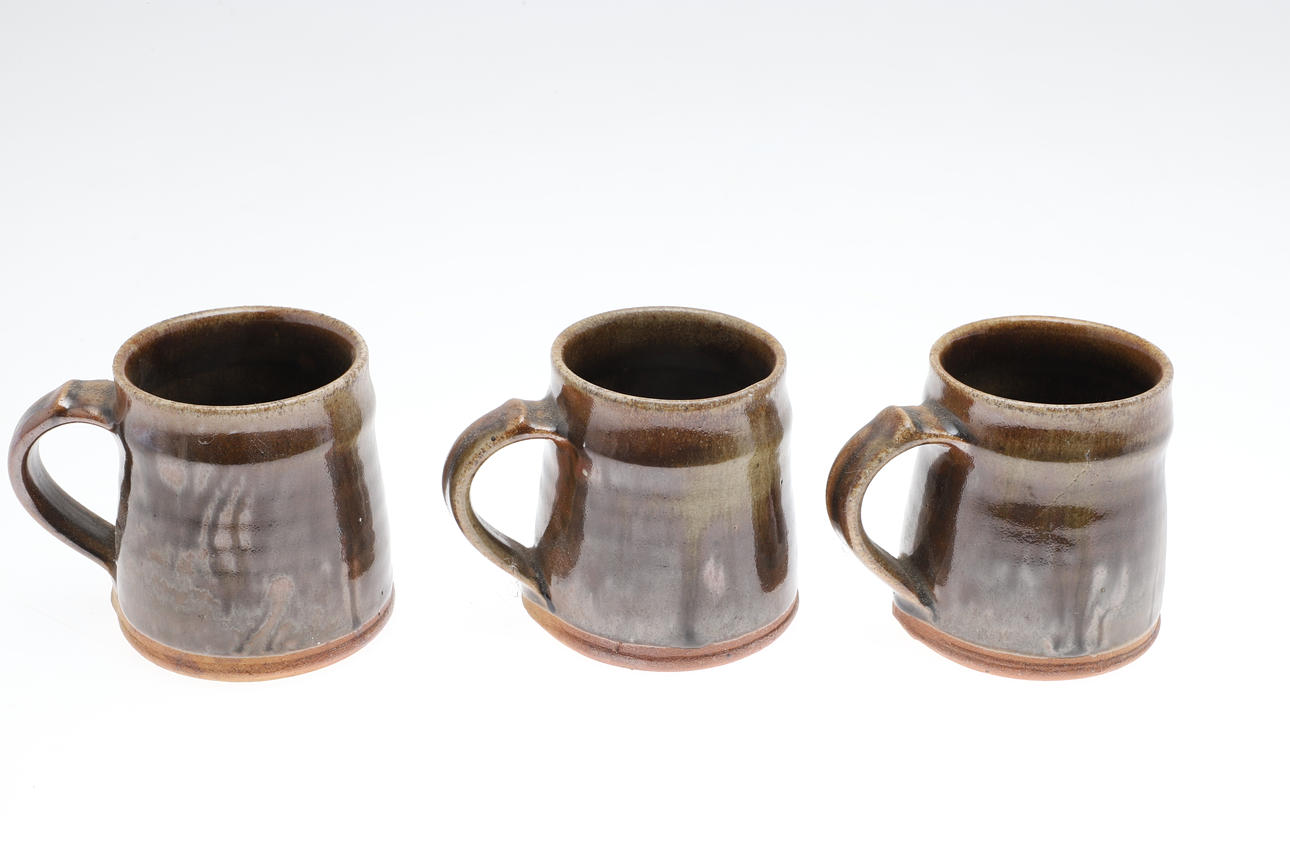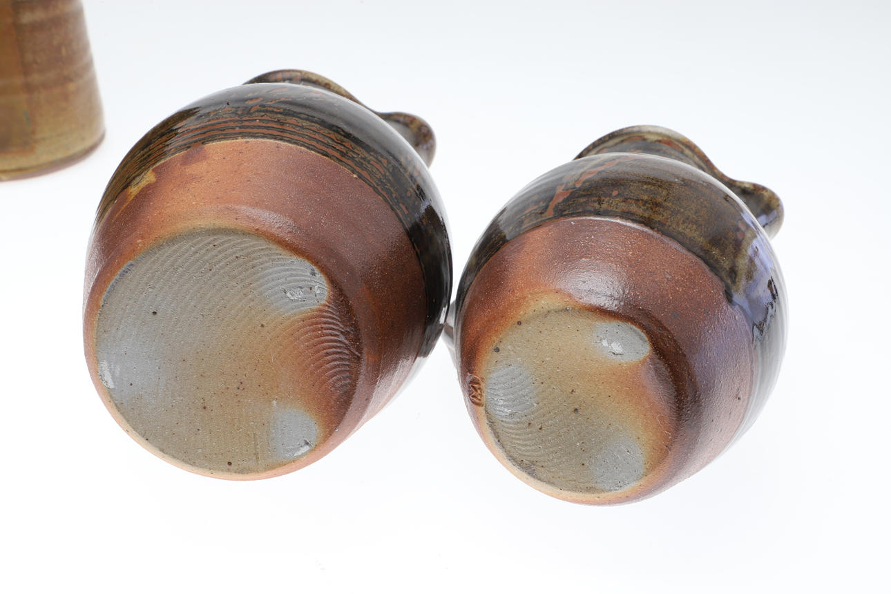 Including two glazed stoneware jugs of differing sizes (21.5cms and 18cms high, one with potters mark), a set of three pottery mugs (9.5cms high, all with potters mark), two oval shaped vases (28cms and 21 cms high, both unmarked), and a rectangular dish (21cms by 15cms, unmarked). (8)