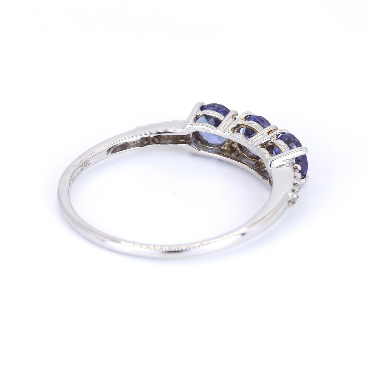 A 10ct white gold ring set with tanzanites and zircons to the shoulders.UK ring size: U.