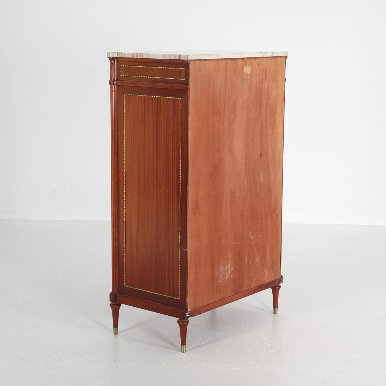 Brass sleeves loose. Abrasions, marks. The brass plate decorative moldings have partially released and these have wear. Legs slightly weak.