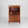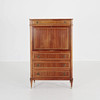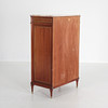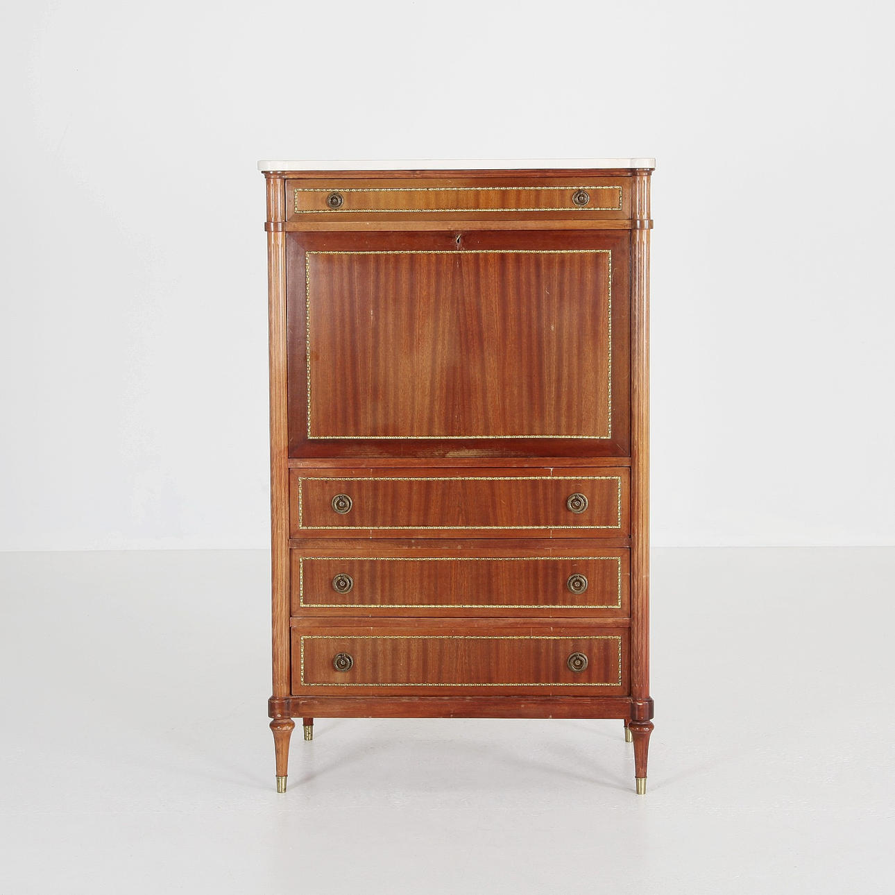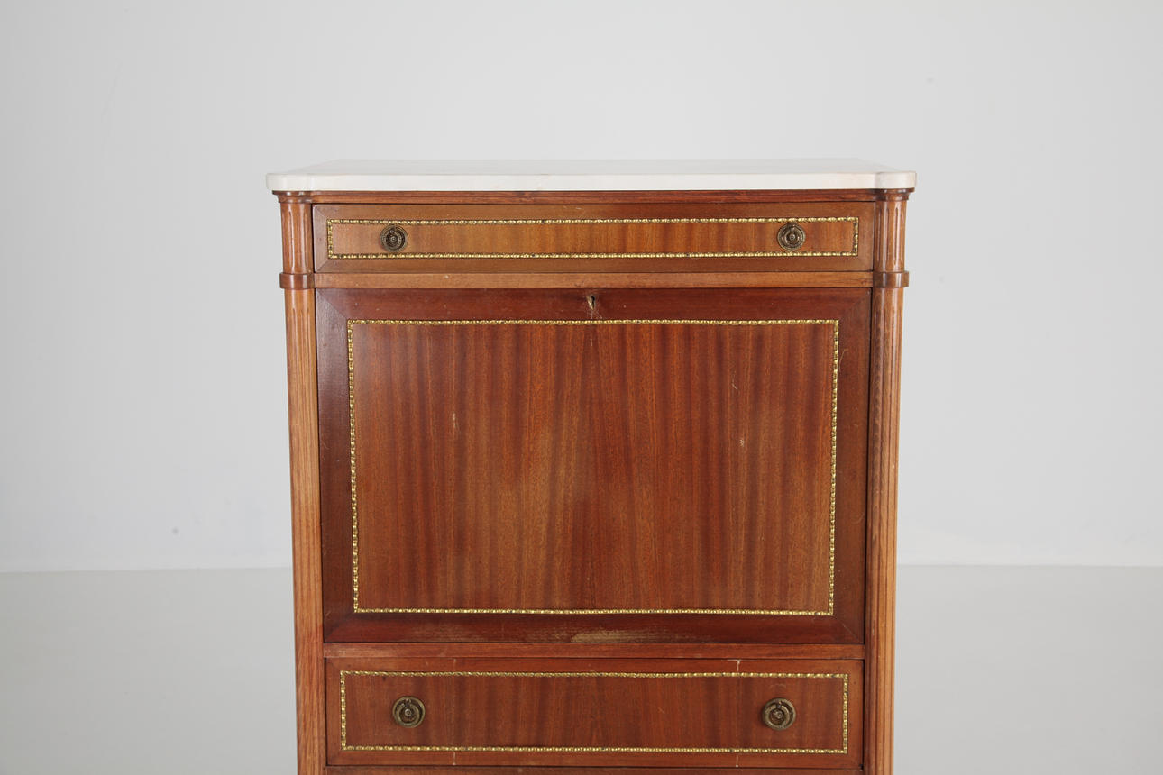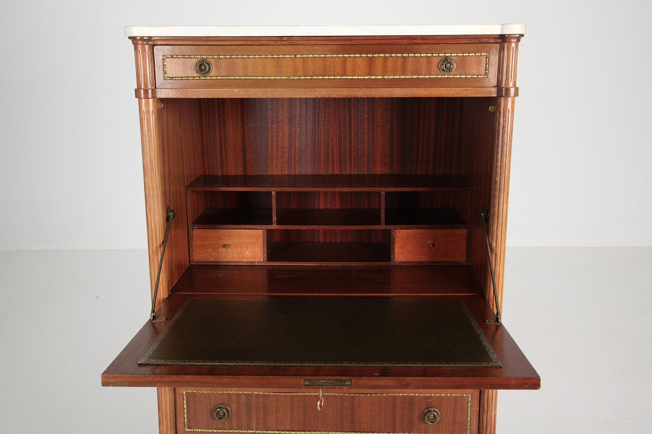 High writing desk with pink melange marble top. Interior behind writing flap, green leather. Lock and key.