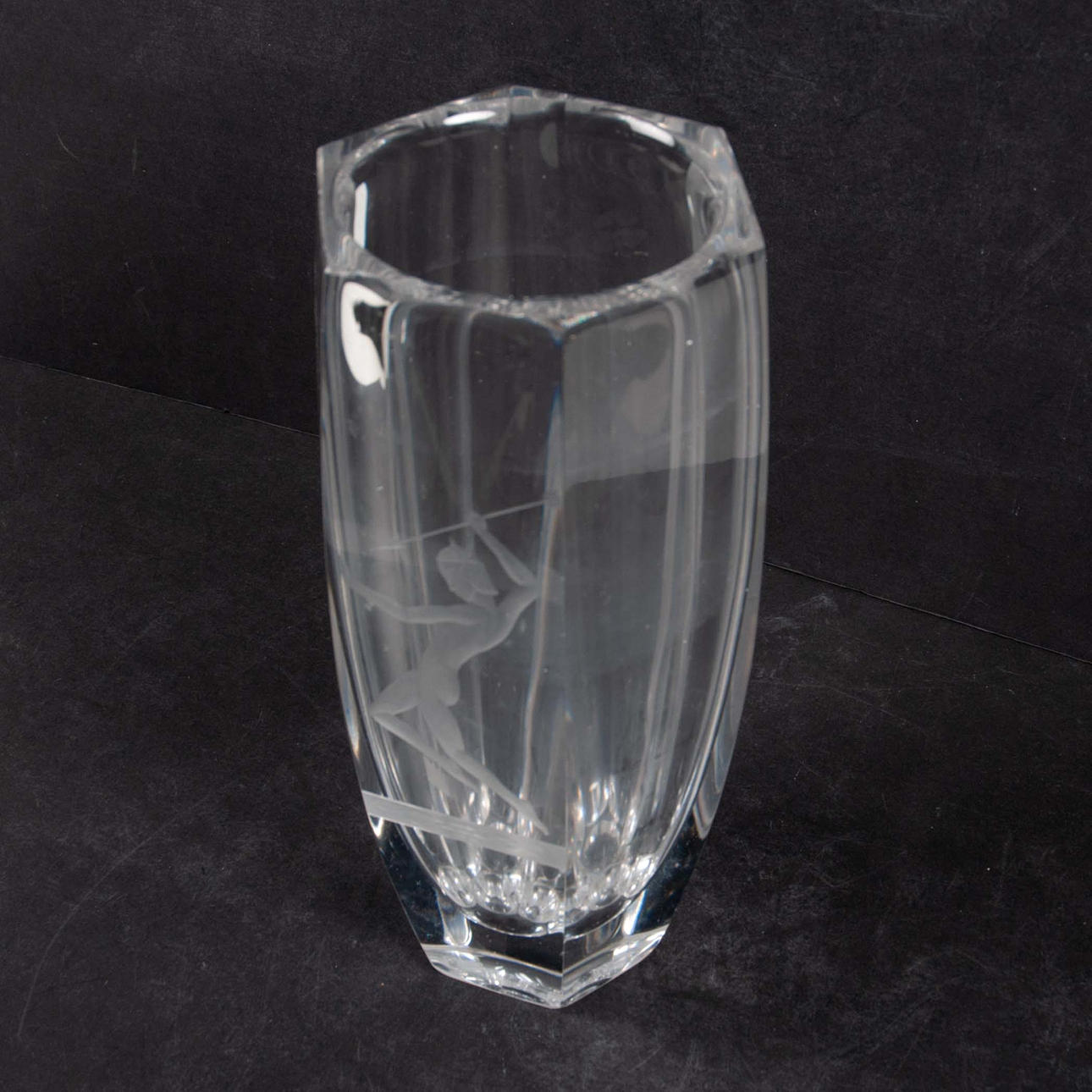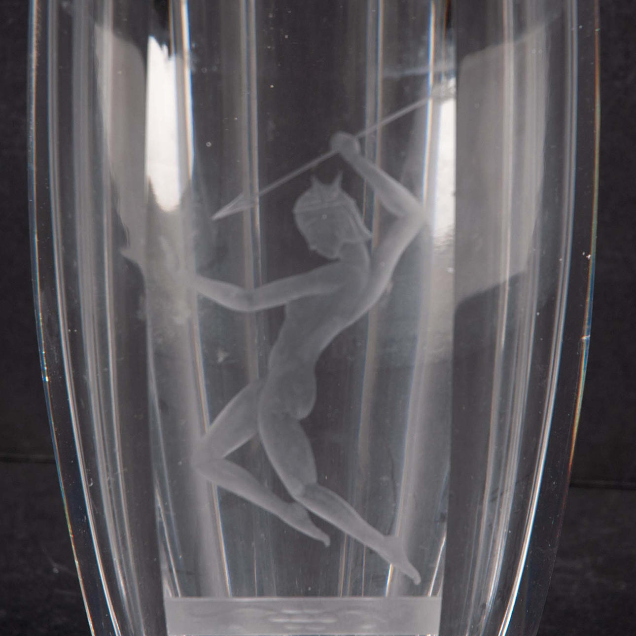 Height 24,5 cm and 11 cm in ø Engraved North. Crystal Industry Malmö Decor in the form of a spear thrower.