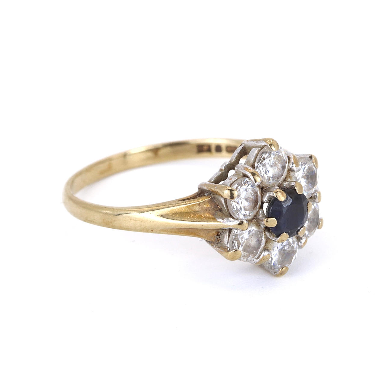 A 9ct yellow gold cluster ring set with sapphire and cubic zirconias. UK ring size: M