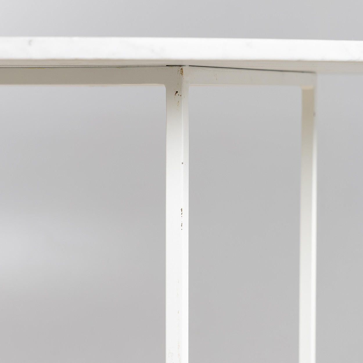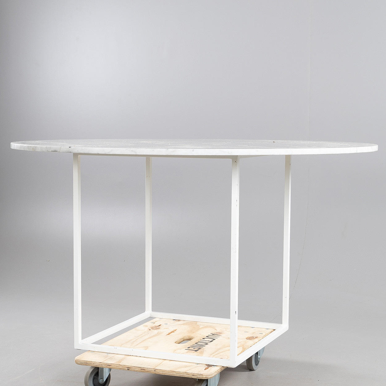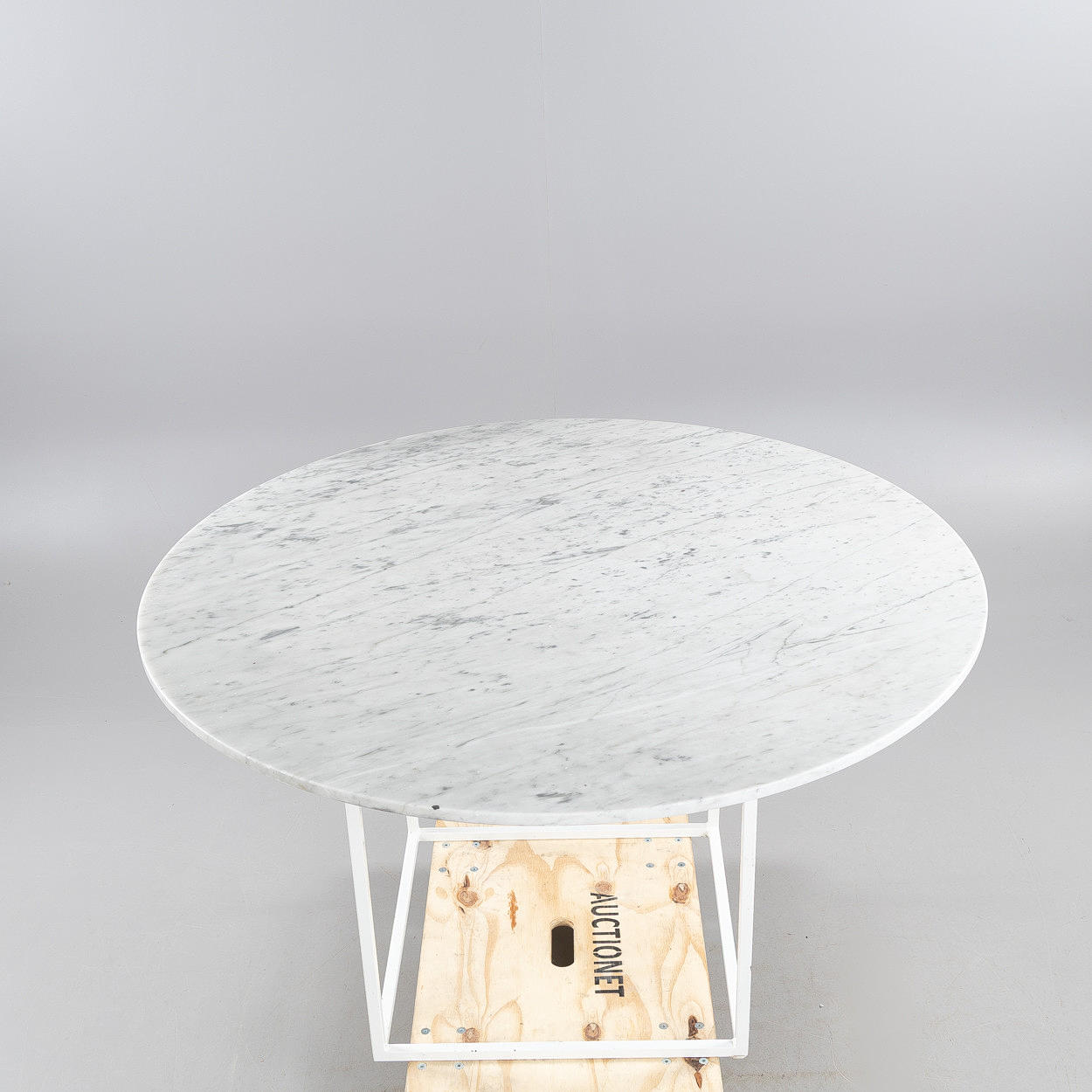 Stands in lacquered metal. Loose disc of polished marble. Height approx. 72 cm, diameter approx. 130 cm. Lack of marking.