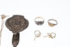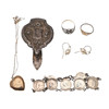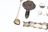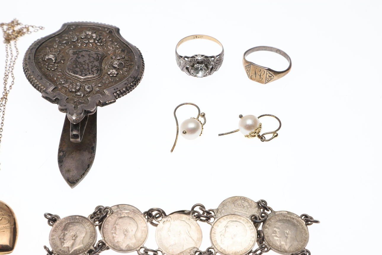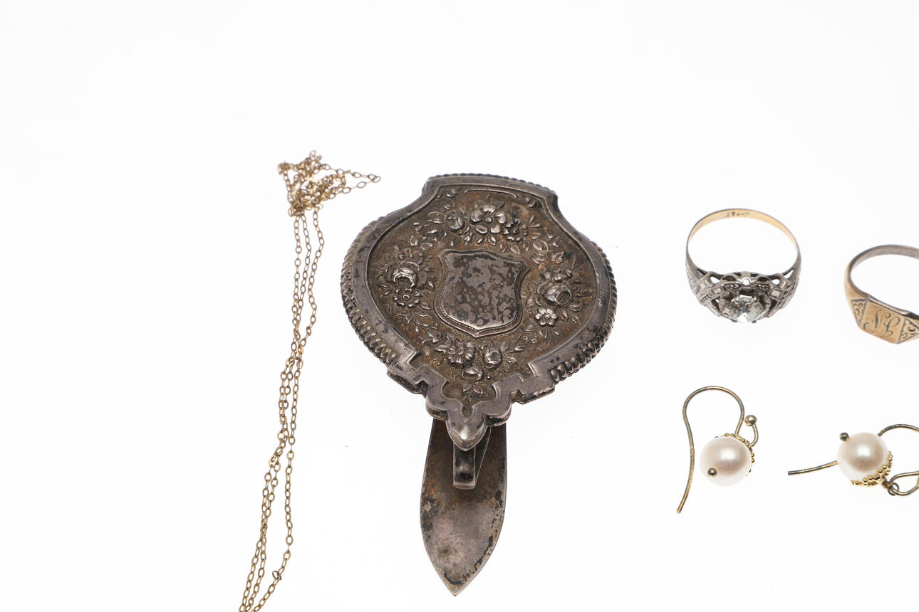 the bracelet set 9 silver 3d pieces, a silver and paste set ring, à gérât shaped locket on rolled gold chain, a silver gilt signet ring, a pair of silver gilt and cultured Pearl earrings, and a white metl Chatelain clip.