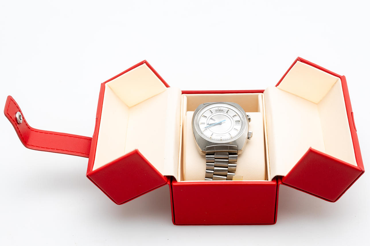 Omega Seamaster “Memomatic” Ref No. 166.072 Caliber No. 980. Stainless steel case, silver dial with hour, minute and second hands with alarm function. plexiglass, screwed caseback, automatic movement, case dimensions diameter diameter approx. 40 mm with box The clock was ticking at the time of the review, Stockholm's auction shop does not guarantee functionality.