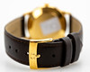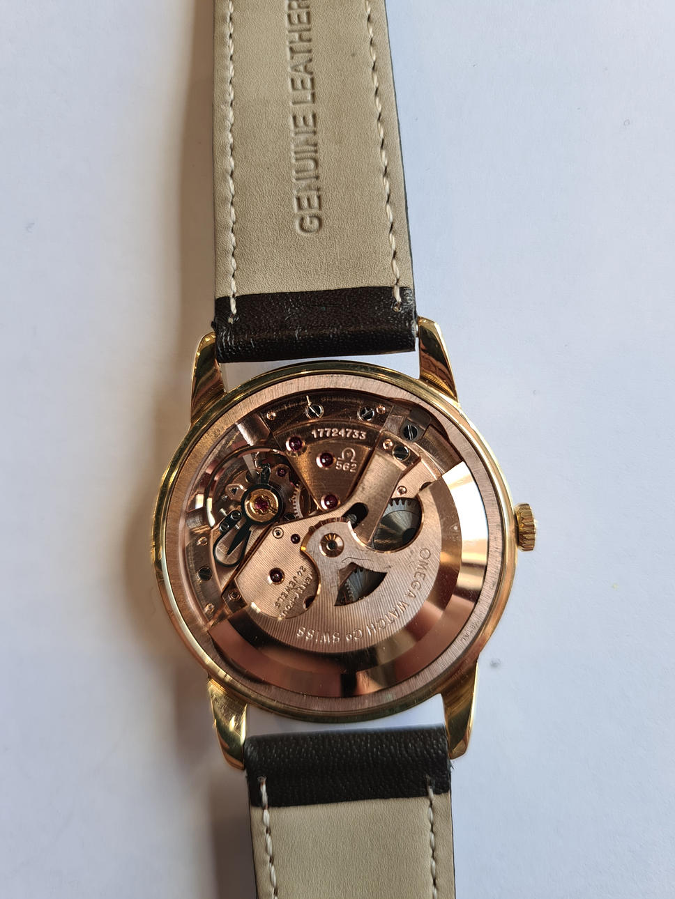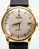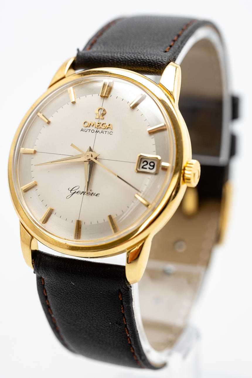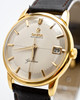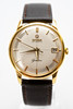 Omega men's bracelet watch, ref. 14703-4, 18kt case. Gold, silver dial with minutes, hour and second hands, date at '3' clock, plastic glass, leather strap with pin buckle, automatic movement cal. 562. Dimensions approx. Diameter Ø 33.5 mm. The clock was ticking at the time of the review, Stockholm's auction shop does not guarantee functionality.