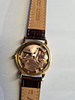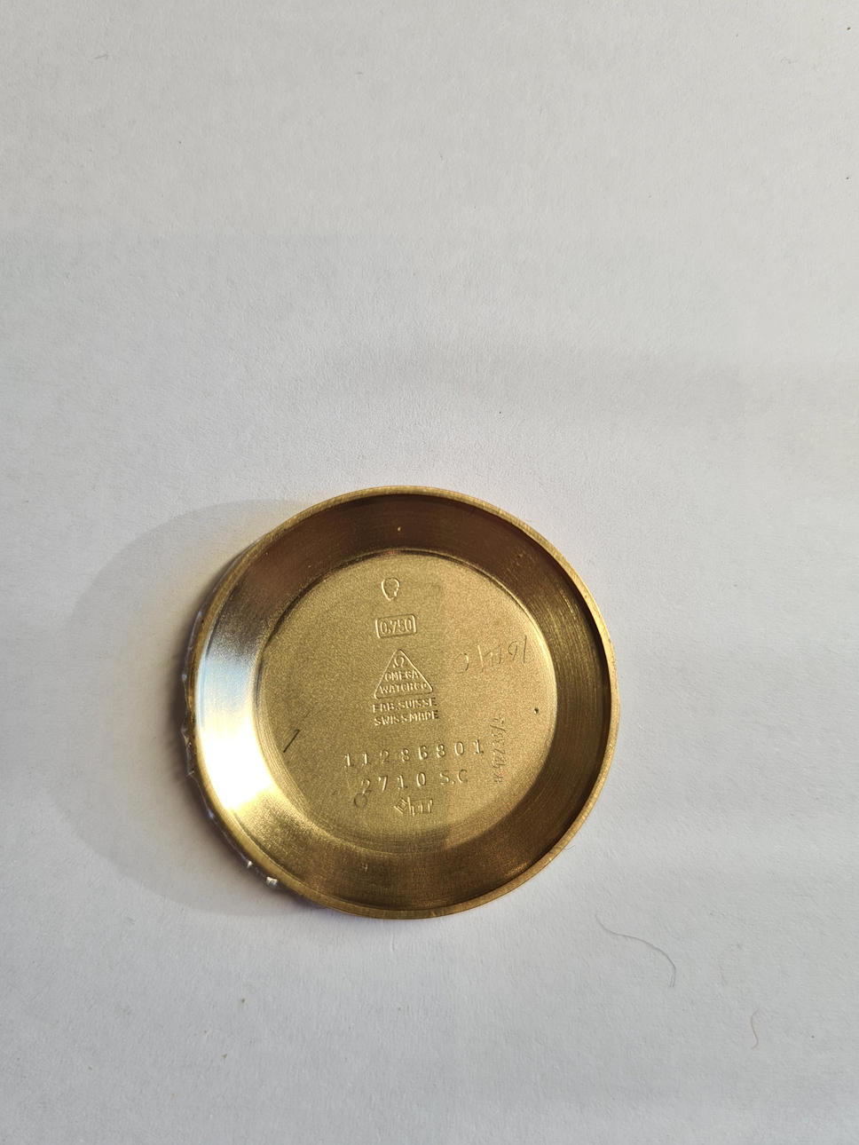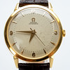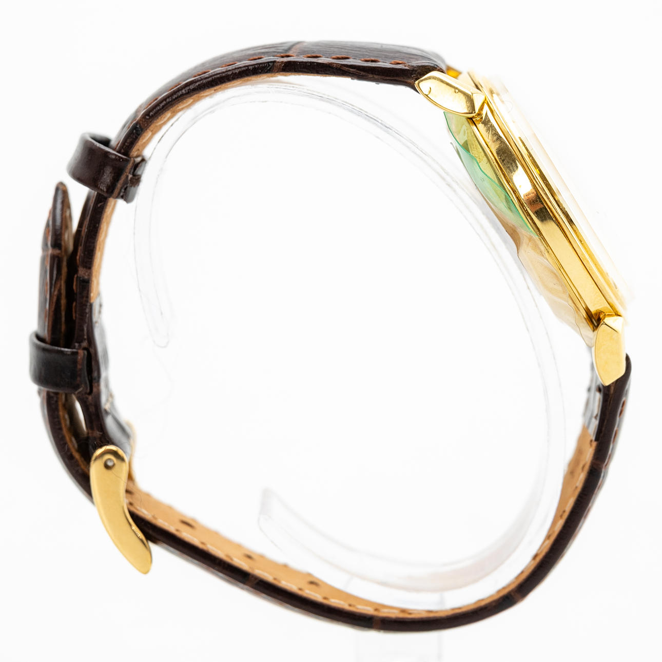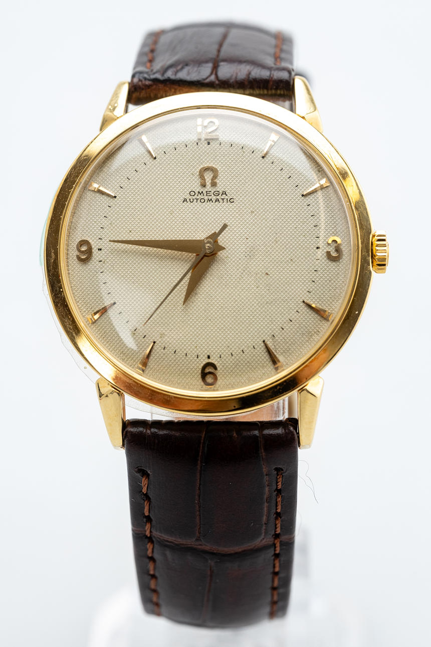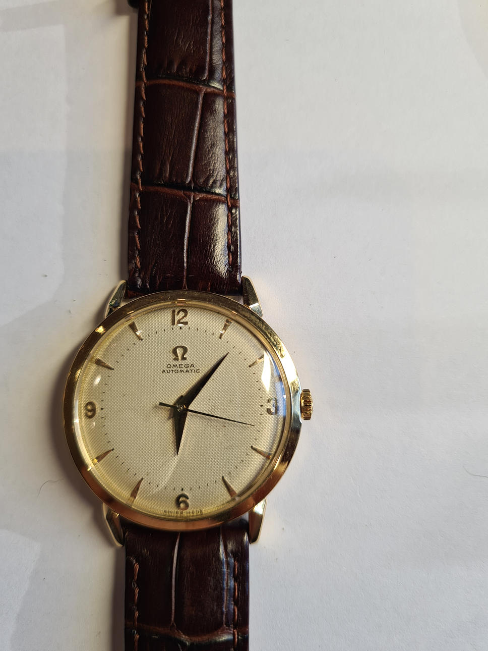 Omega men's bracelet watch, ref. 2710 SC, 18kt housing. Gold, cream-colored dial with minute, hour and second hands, plastic glass, leather strap with pin buckle not from Omega, hammer automatic movement cal. 354. Dimensions approx. Diameter Ø 34.5 mm. The clock was ticking at the time of the review, Stockholm's auction shop does not guarantee functionality.