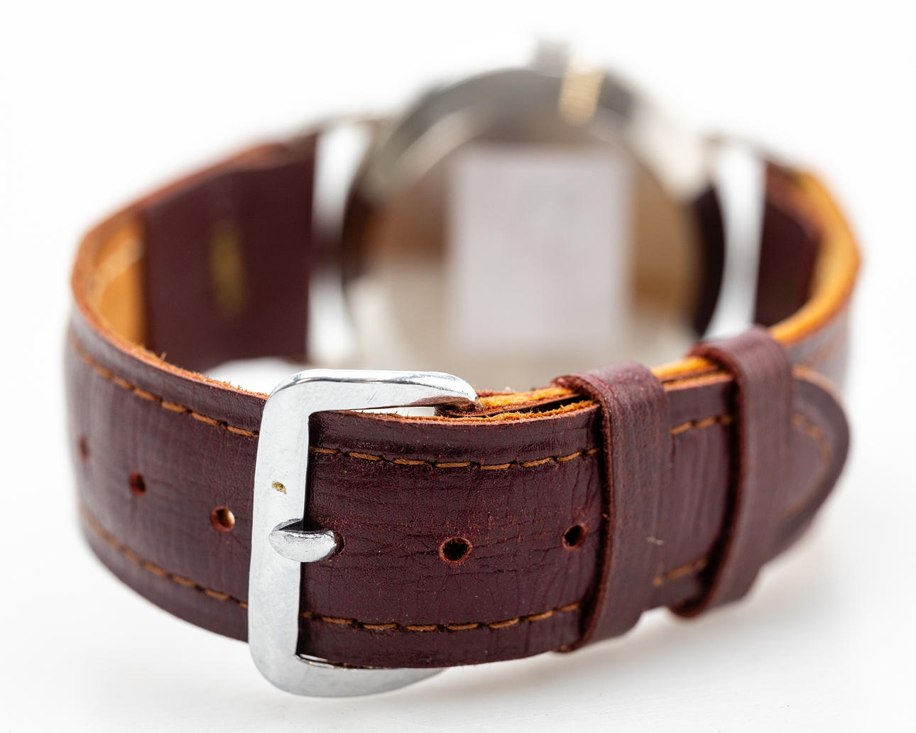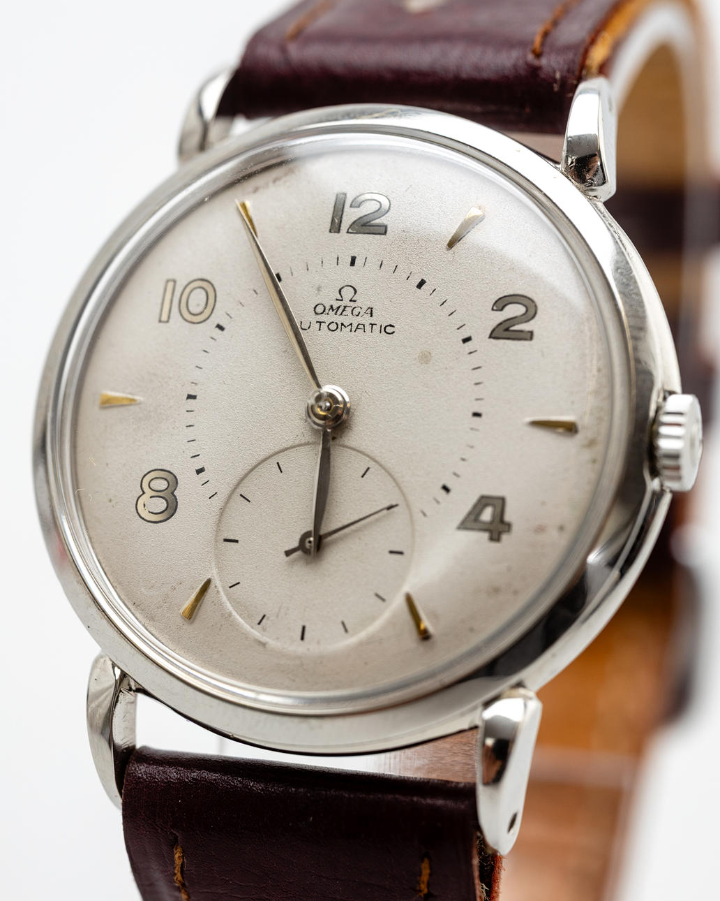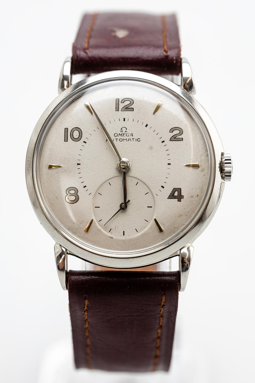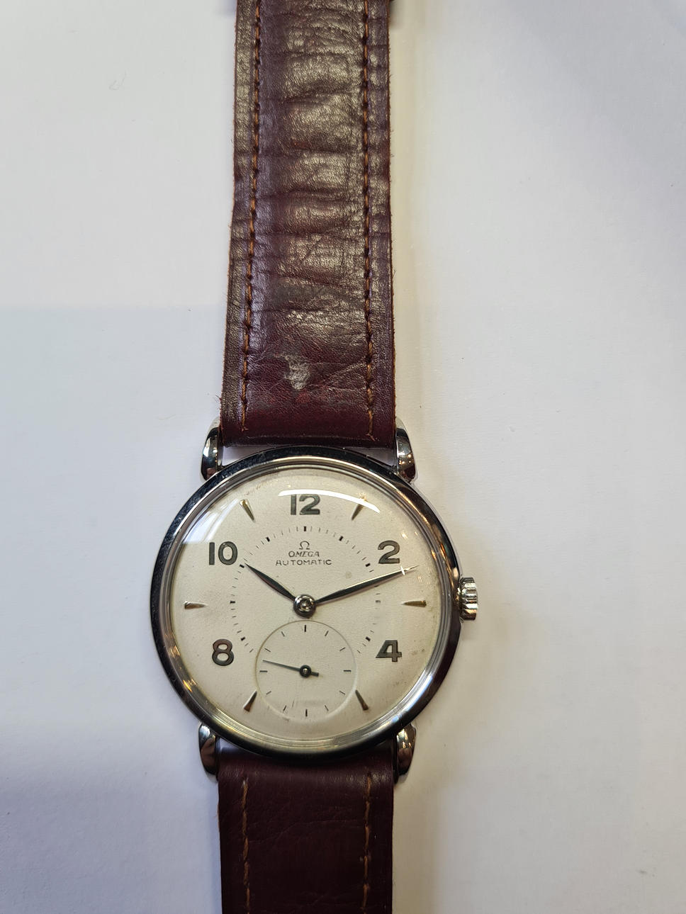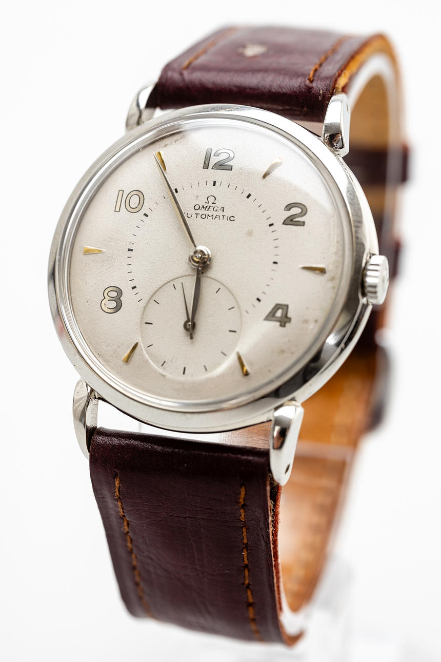 Omega wristwatch. Stainless steel case, dial with minute and hour hands and small seconds. Hammer automatic movement. Dimensions approx. Case diameter 32.5 mm. Leather strap with pin buckle not from Omega. The clock was ticking at the time of the review, Stockholm's auction shop does not guarantee functionality.