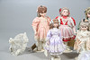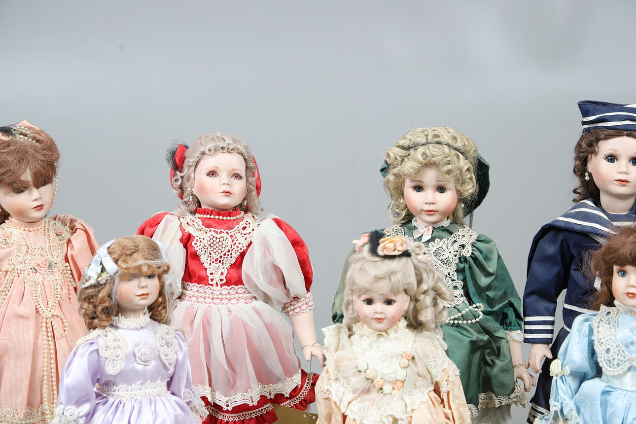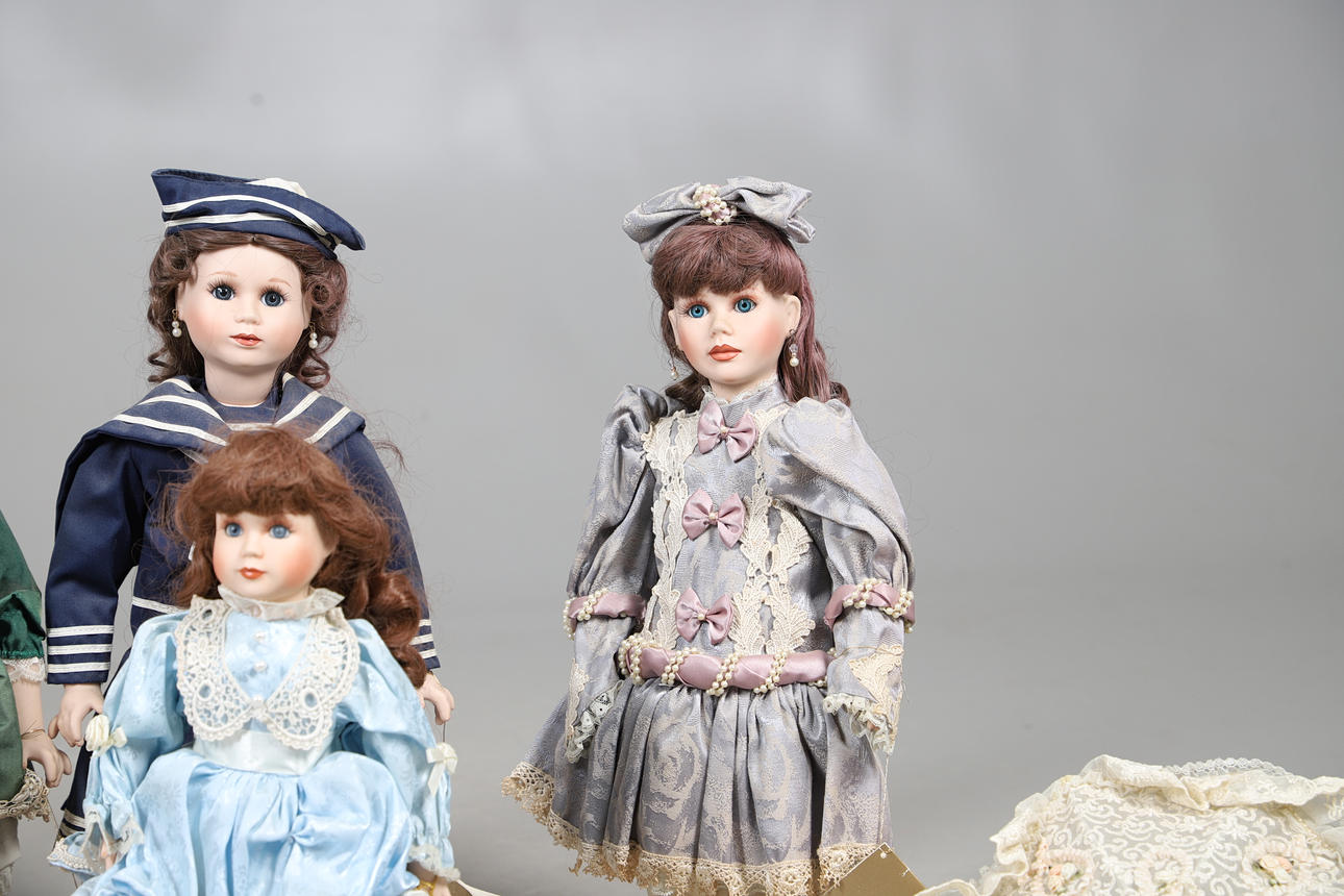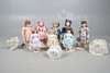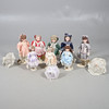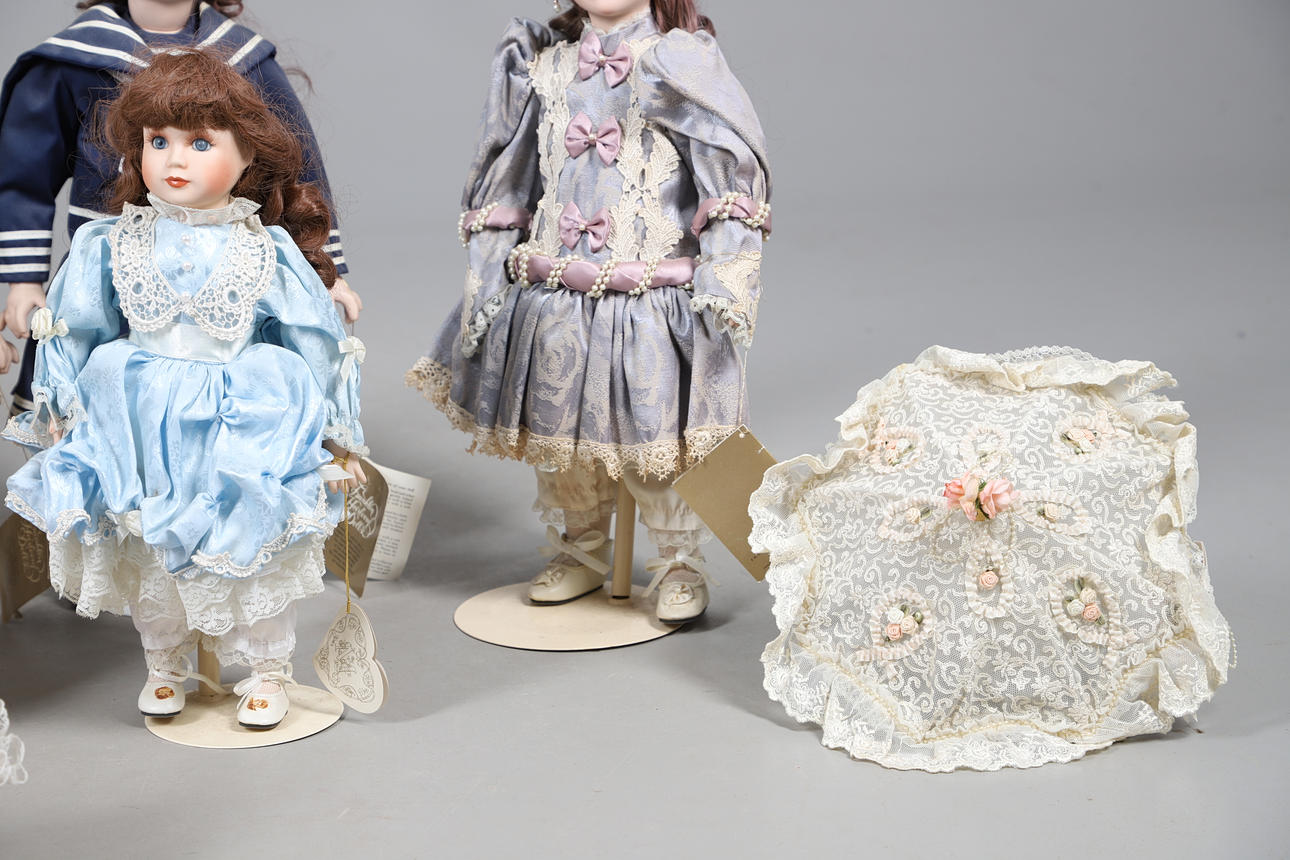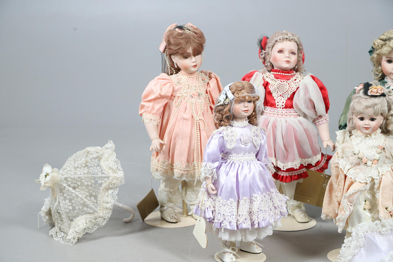 A quantity of Franklin heirloom mint bisque head dolls, to include five larger dolls, four in formal attire and one in a sailor style outfit, and three smaller dolls in different colour dresses. Together with three umbrellas. Size of larger, 48cm high. (8 dolls).