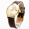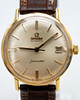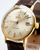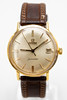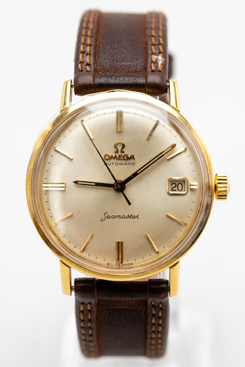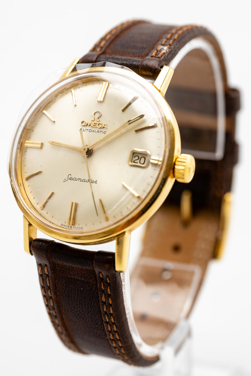Omega men's bracelet watch, model 'Seamaster. ' , Ref. 14910 SC-62, 18kt housing. Gold, silver dial with minutes, hour and second hands, date at '3' clock, plastic glass, leather strap with pin buckle not from Omega, automatic movement cal. 562. Dimensions approx. Diameter Ø 34.5 mm. The clock was ticking at the time of the review, Stockholm's auction shop does not guarantee functionality.