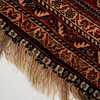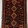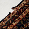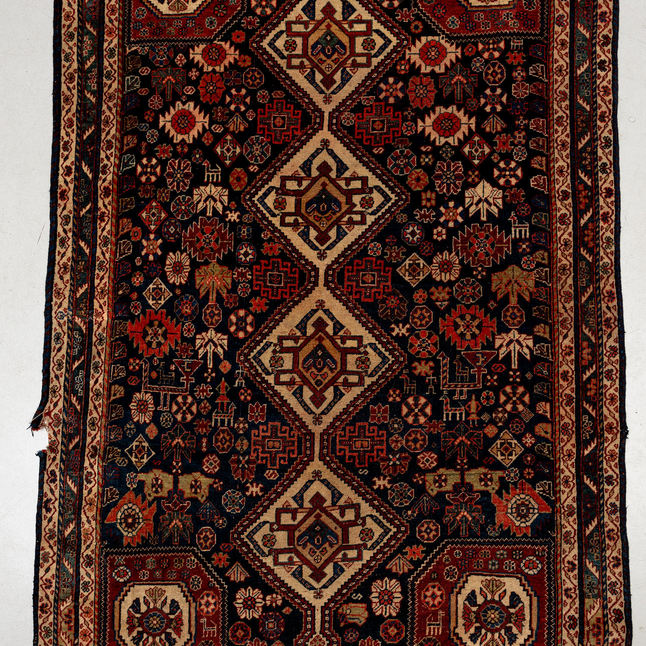 Blue base with polychrome geometric and stylized floral pattern with man shoes and animals, approx. 218x138 cm.