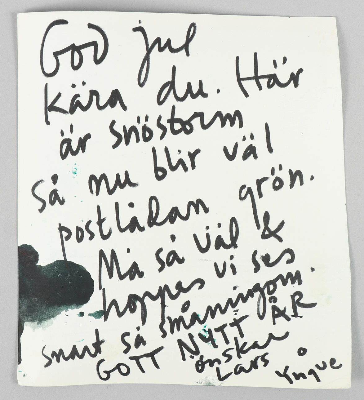 “Merry Christmas, dear. It's a snowstorm, so now the mailbox is turning green. Good luck and hope to see you soon and happy new year wishes Lars o Yngve”.