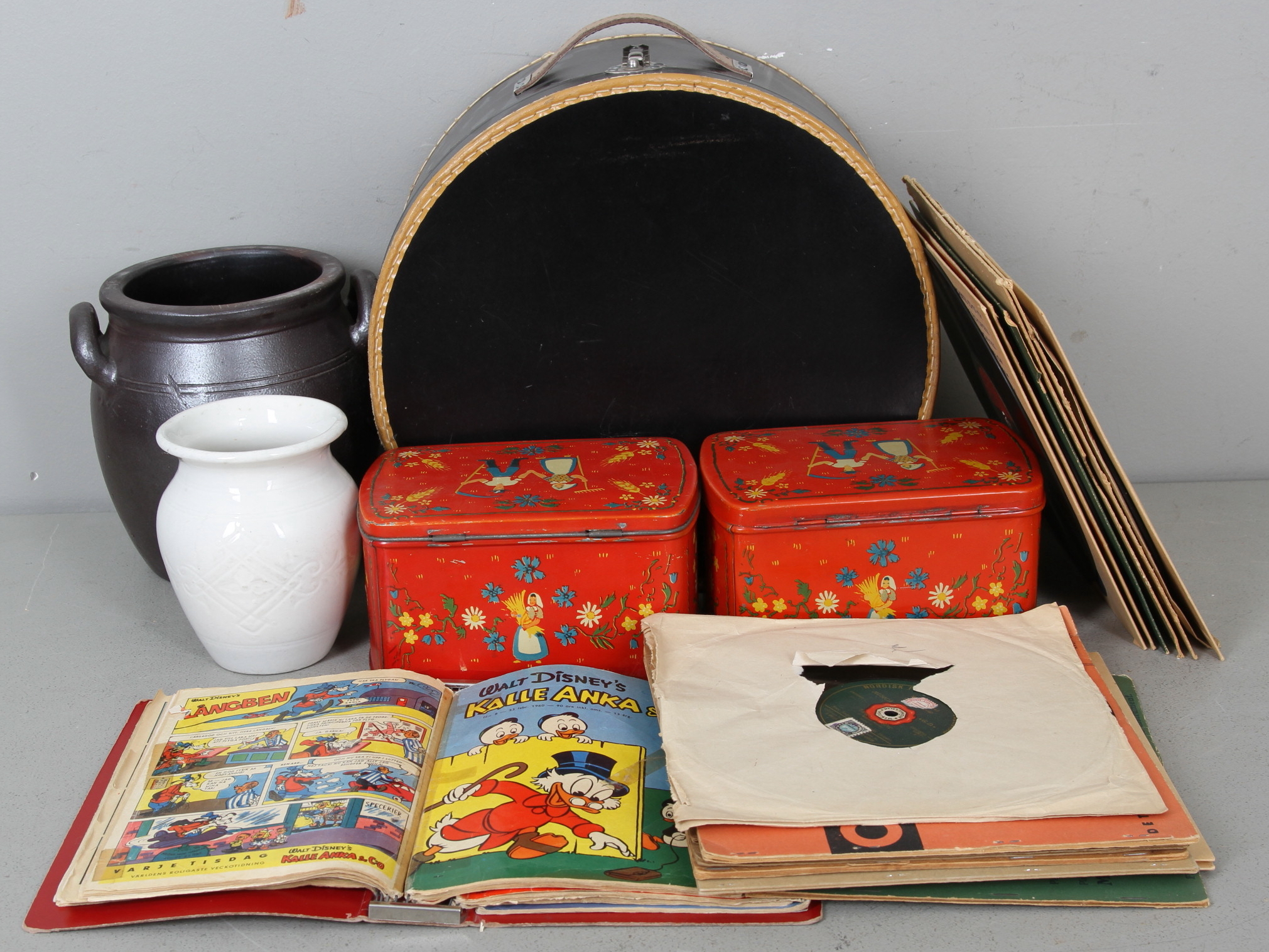 49643. MISCELLANEOUS ITEMS, hat box, mug tin cans.