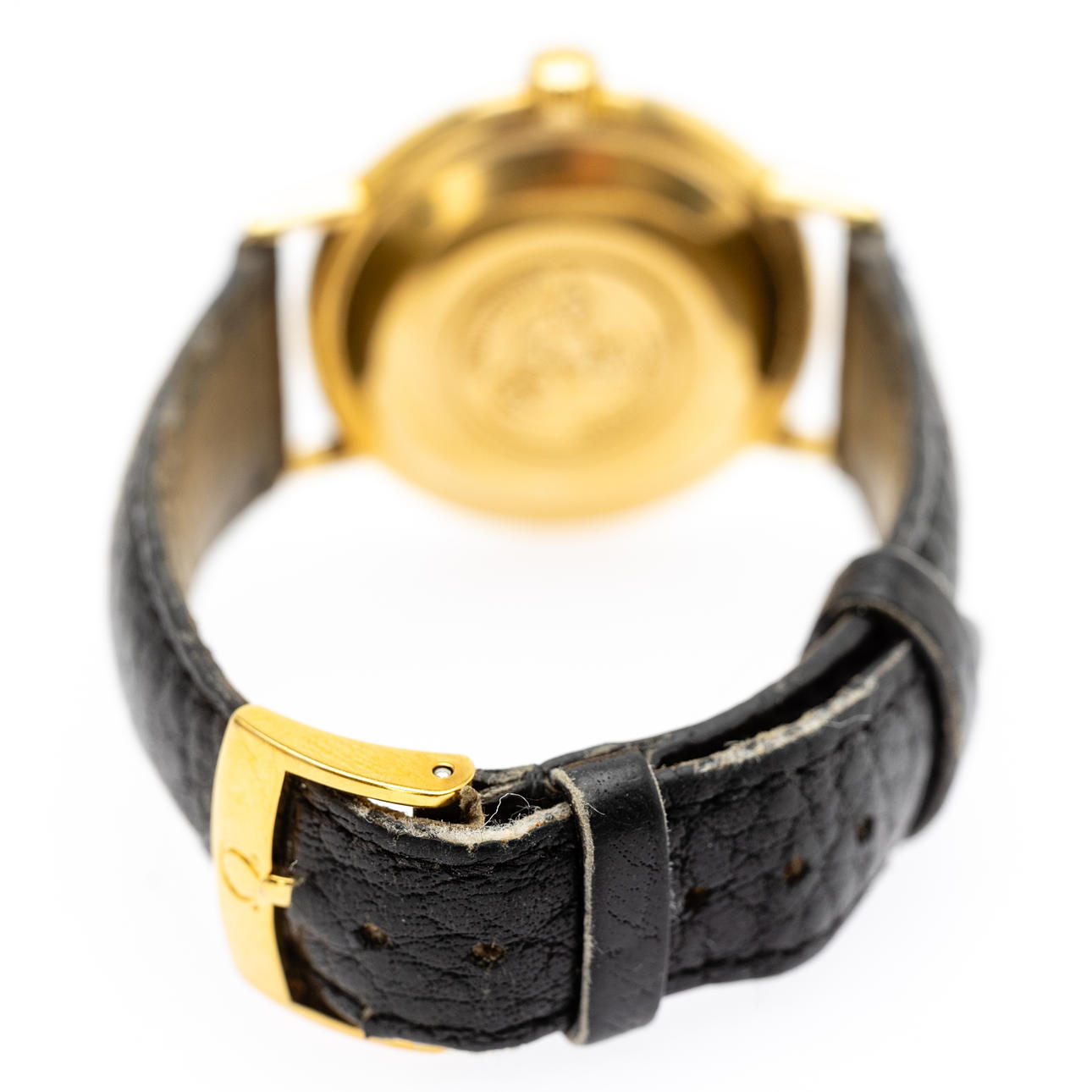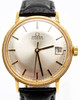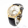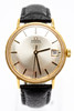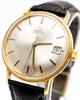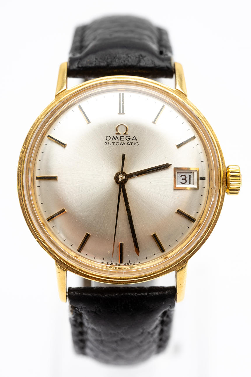 Omega men's bracelet watch, 18kt case. Gold, silver dial with minutes, hour and second hands, date at '3' clock, plastic glass, leather strap with pin buckle, automatic movement cal. 561 Dimensions approx. Diameter Ø 34.5 mm. The clock was ticking at the time of the review, Stockholm's auction shop does not guarantee functionality.